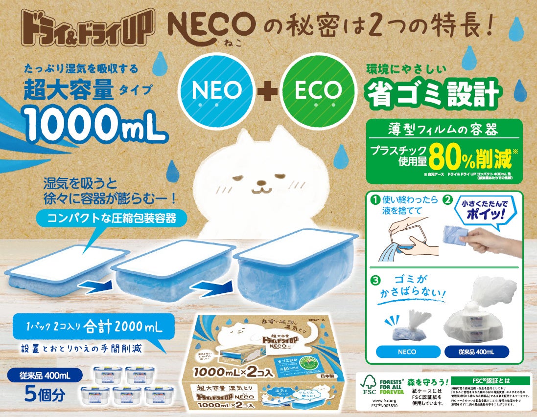白元アース株式会社(本社:東京都台東区、社長:吉村一人)は、超大容量の1000mLを除湿できて、環境にもやさしい省ゴミ設計の除湿剤『ドライ&ドライUP NECO(ねこ) 1000mL』を4月1日より新発売いたします。