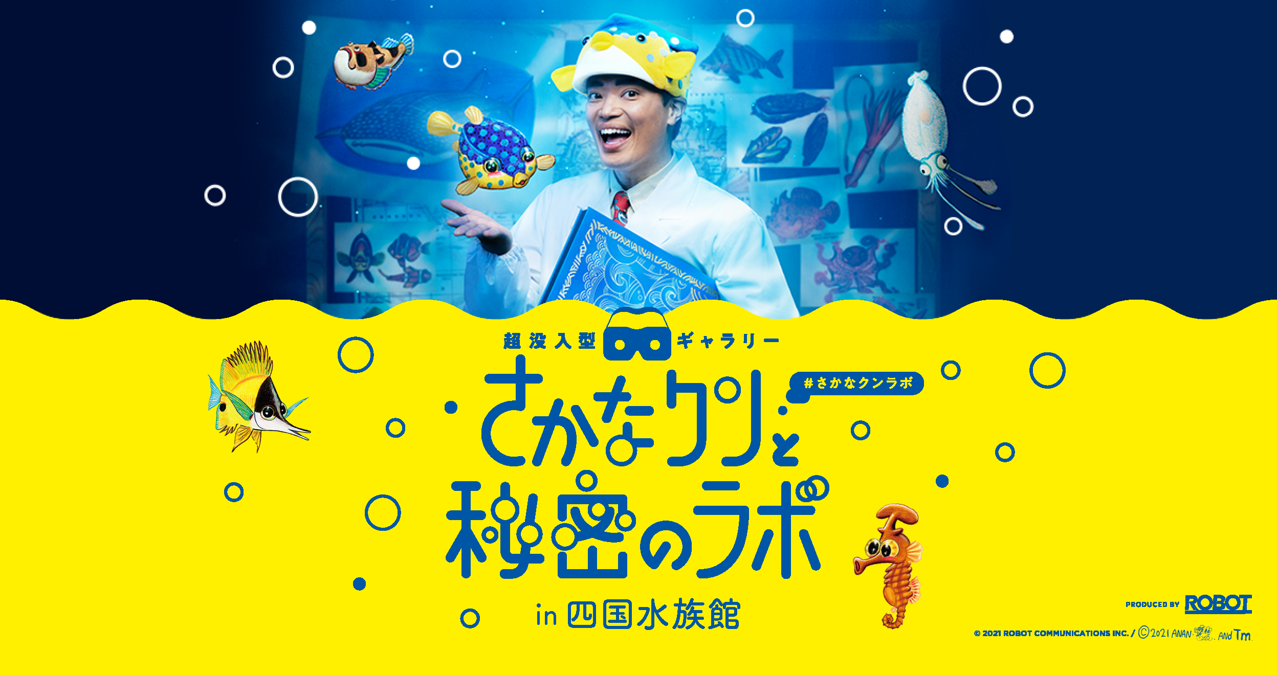映像の企画から制作、映像編集、配信・流通に至るまでを、グローバルにワンストップでお届けする株式会社IMAGICA GROUP(代表取締役社長:布施 信夫/本社:東京都千代田区)のグループ会社で、映画・TVCMなどを中心とした映像エンタテインメントやイベントの企画プロデュースを手掛ける株式会社ロボット (以下「ROBOT」)は、VR で海中探索ができる超没入型ギャラリーイベント「さかなクンと秘密のラボin 四国水族館」の企画・制作を行いました。2021 年12 月25 日(土)~2022年1月10 日(月・祝)に四国水族館(館長:松沢 慶将 所在地:香川県綾歌郡宇多津町浜一番丁4)にて開催されます。