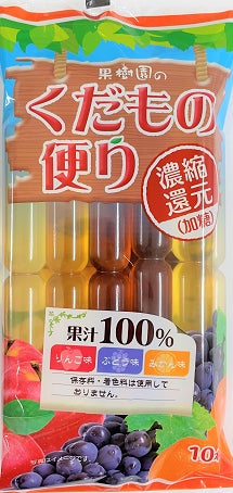 商品特徴:着色料、保存料不使用の果汁100%の棒ジュース。りんご・ぶどう・みかん味。