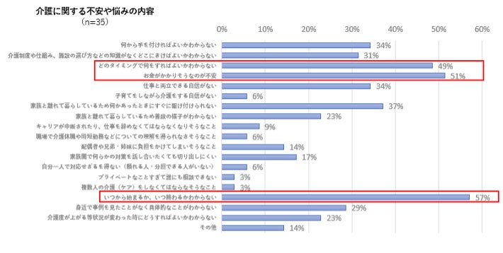 不安や悩みの内容については、近い将来に介護が始まることを予想しながらも、まだ介護が始まっていない「介護予備軍」の人たちは、「介護がいつ始まるか・いつ終わるかわからない」「お金がかかりそうだがいくらかかるかわからない」「どのタイミングで何をすればよいかわからない」など、知識がないことによる不安や、介護対象者の状況により変動する事柄への不安など、「よくわからない」ことに不安を感じていることが多いことがわかりました。