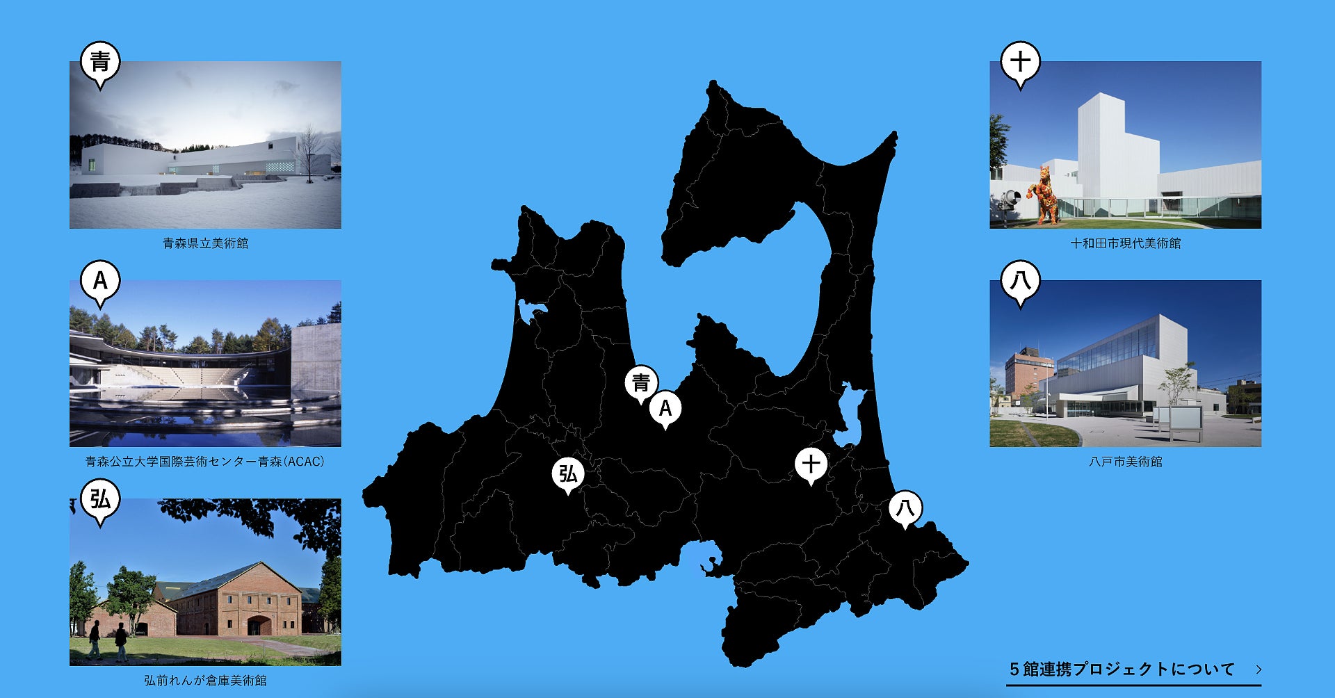 [青森県立美術館、青森公立大学 国際芸術センター青森、弘前れんが倉庫美術館、八戸市美術館、十和田市現代美術館、青森県、青森市、弘前市、八戸市、十和田市、(公社)青森県観光国際交流機構]