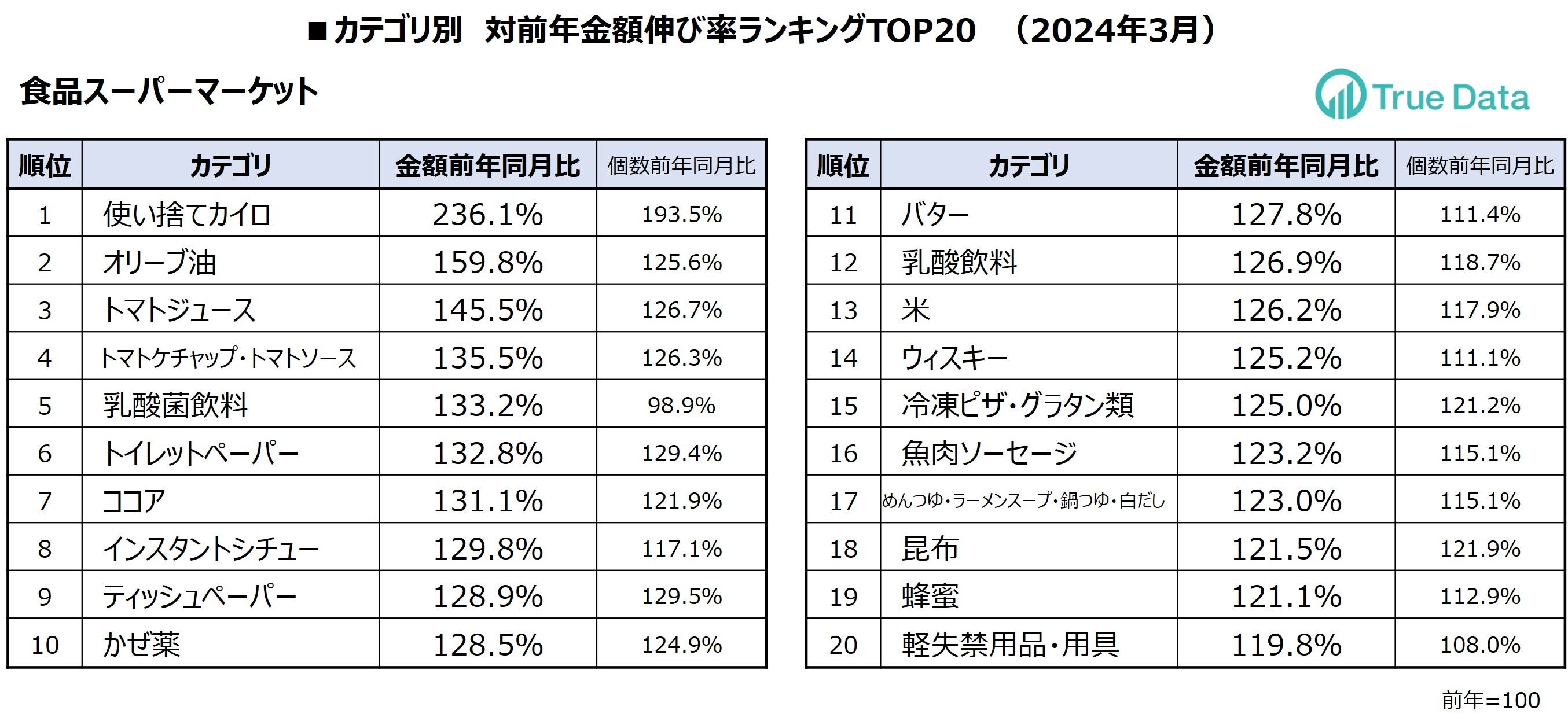 ビッグデータプラットフォームを運営する株式会社True Data(トゥルーデータ/本社:東京都港区、代表取締役社長:米倉 裕之、証券コード4416)は、当社の統計データをもとに、ドラッグストア、食品スーパーマーケットにおける2024年3月の売り上げ伸長カテゴリを発表します。食品スーパーマーケットで「オリーブ油」の売り上げが大きく伸長し、伸び率TOP20の2位にランクインしました。複数メーカーが5月からのオリーブ油の値上げを発表しており、値上げ前の駆け込み需要が4月も続くのか注目されます。