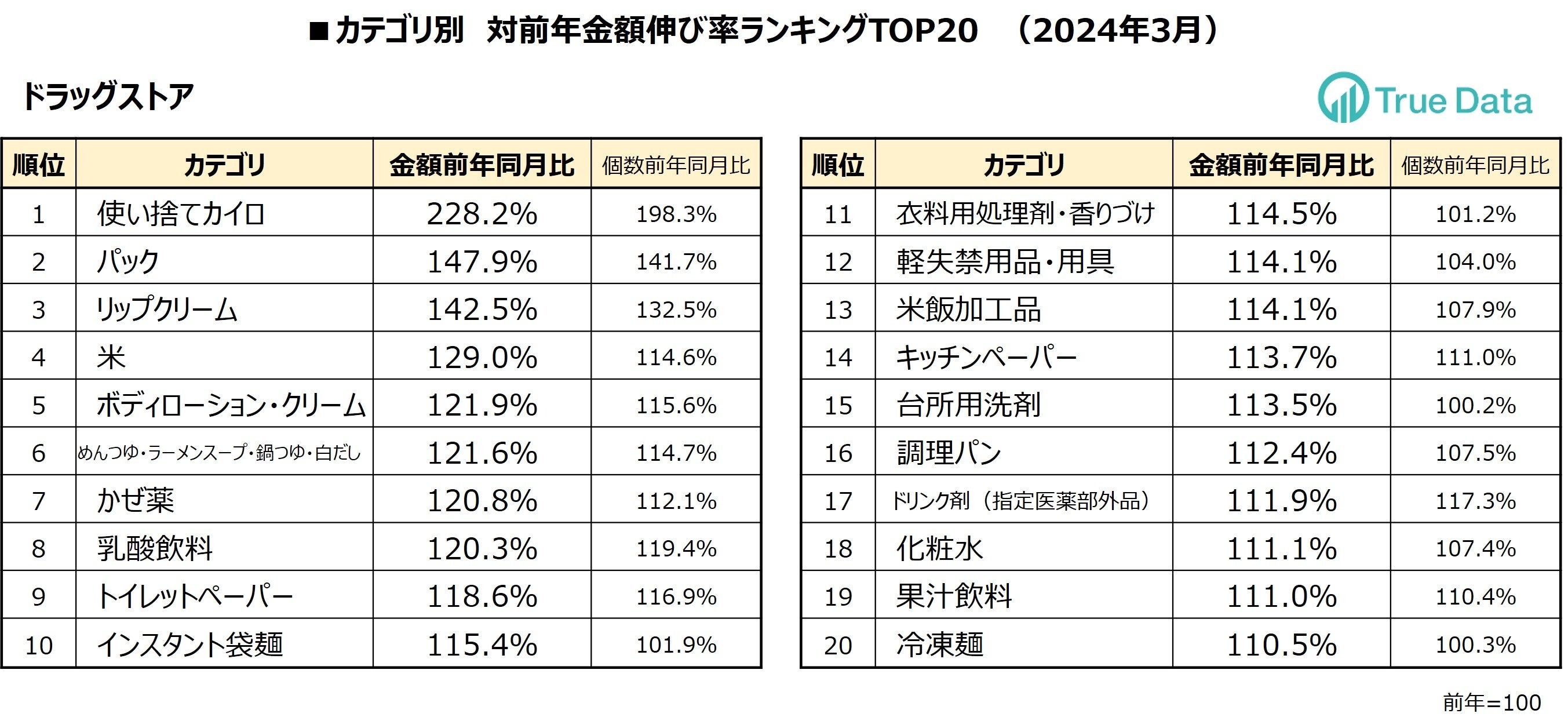 ~ドラッグストア、食品スーパーマーケット 2024年3月対前年伸び率TOP20カテゴリを発表~