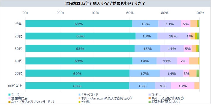 2. お酒はスーパーマーケットで61%が購入、飲酒頻度は87%が週に1回以上