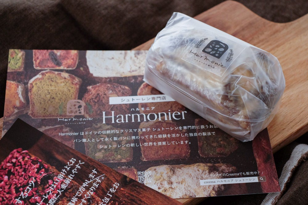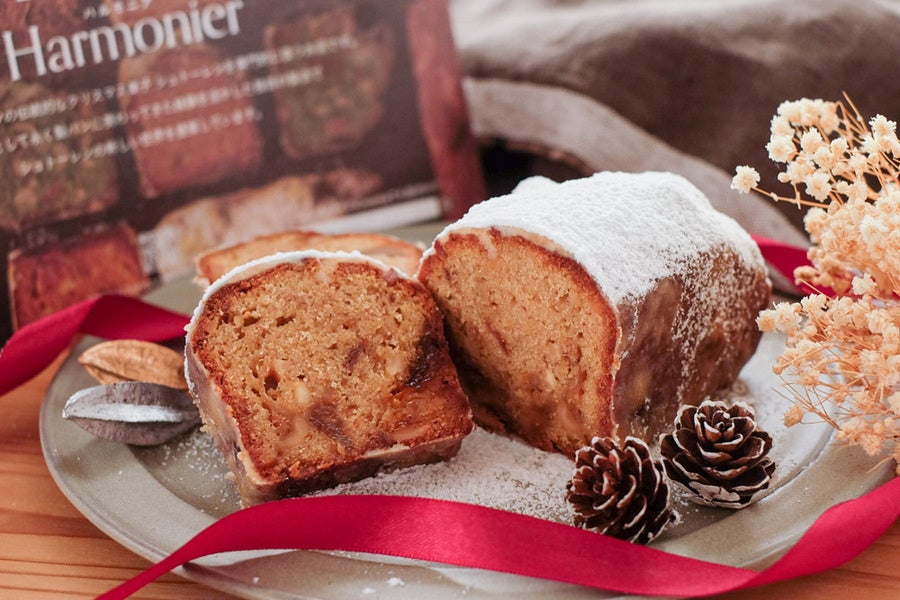 メディアにも取り上げられるシュトーレン専門店「ハルモニア」のシュトーレンです。毎年何種類ものフレーバーのシュトーレンを手がけており、メディアにも取り上げられる人気ぶりですが、今回は王道のプレーンをご用意いたしました。ハルモニアのシュトーレンを一言で象徴するなら「バター」!惜しまずバターを使ったシュトーレンはここまでしっとり&芳醇な香りなのか...と感動していただけること間違いなしです。ヨーグルトから起こした自家製の天然酵母を使っていることも相まってか、口の中が一瞬でミルク感で満たされます。中の具材は洋酒にじっくり漬け込んだ高級ドライフルーツ。これがどこをかじっても必ず口に入るくらいの密度で詰まっています。大きさは小ぶりで、見た目だけではすぐ食べ終わりそうな雰囲気がありますが、口に入れると一口の満足度の高さに驚いてしまいますよ。