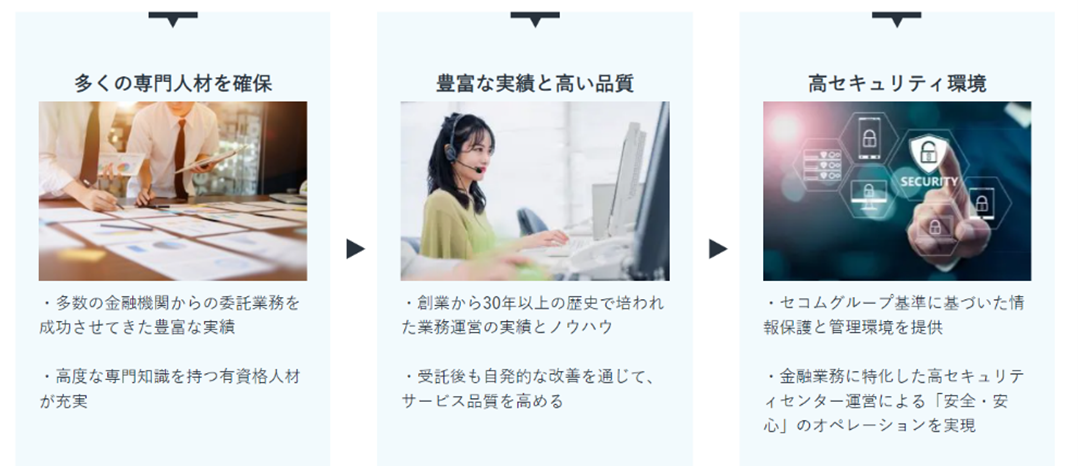 一定規模でBPO業務の設計から運用を提供できるアウトソーサーが国内では限られるなか、TMJは特に金融業界向けに高い専門性を保有し、受託実績を数多く抱えています。豊富な専門人材と業務ノウハウを活かし、仲介業務までを包括した広範囲での業務請負体制を構築しすることで、深刻な人手不足の解消や運営品質の向上を実現します。また、セコムグループとして培った高いセキュリティ環境と運用を提供することで、お客様から求められる安全性・信頼性を更に高めていきます。