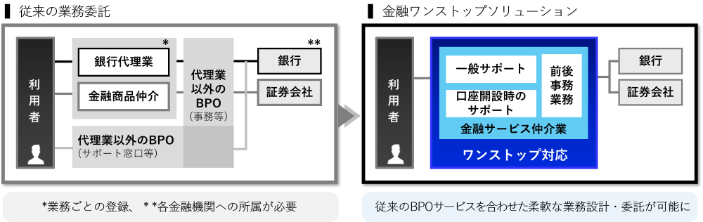 ビジネス・プロセス・アウトソーシング(BPO)における側面では、金融事業者は同じ分野の業務を横断して委託することができるなど、業務の合理化が見込めます。さらにBPO事業者のノウハウを活用しやすくなり、柔軟でシームレスな運営設計が可能となり、お客様の利便性向上への寄与が期待されます。