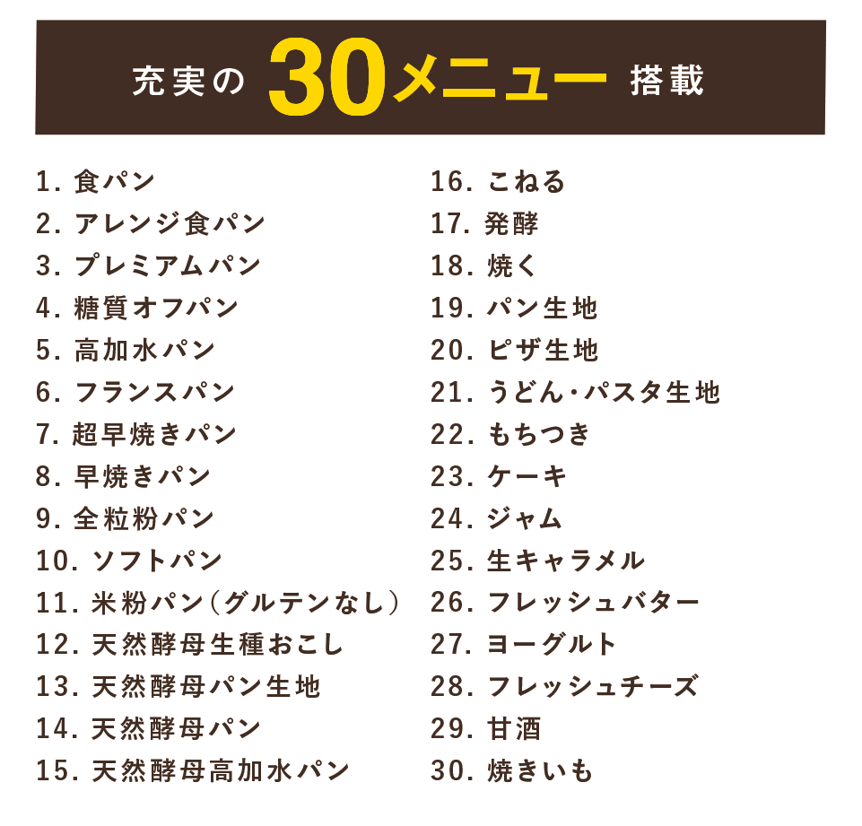 メニュー:1.食パン、2.アレンジ食パン、3.プレミアムパン、4.糖質オフパン、5.高加水パン、6.フランスパン、7.超早焼きパン、8.早焼きパン、9.全粒粉パン、10.ソフトパン、11.米粉パン(グルテンなし)、12.天然酵母生種起こし、13.天然酵母パン生地、14.天然酵母パン、15.天然酵母高加水パン、16.こねる、17.発酵、18.焼く、19.パン生地、20.ピザ生地、21.うどん・パスタ生地、22.もちつき、23.ケーキ、24.ジャム、25.生キャラメル、26.フレッシュバター、27.ヨーグルト、28.フレッシュチーズ、29.甘酒、30.焼きいも