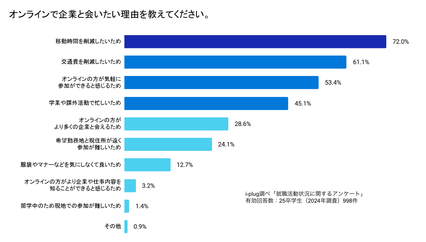 「移動時間を削減したいため」が最多の72.0%。25卒学生は、近年取り上げられている「タイムパフォーマンス(タイパ)」を意識していることが推測されます。次いで「交通費を削減したいため」が61.1%でした。
