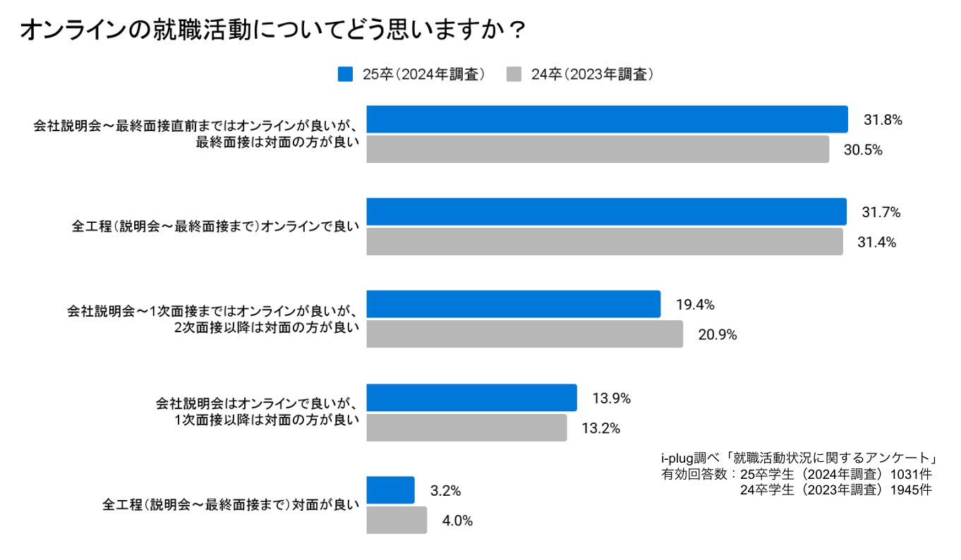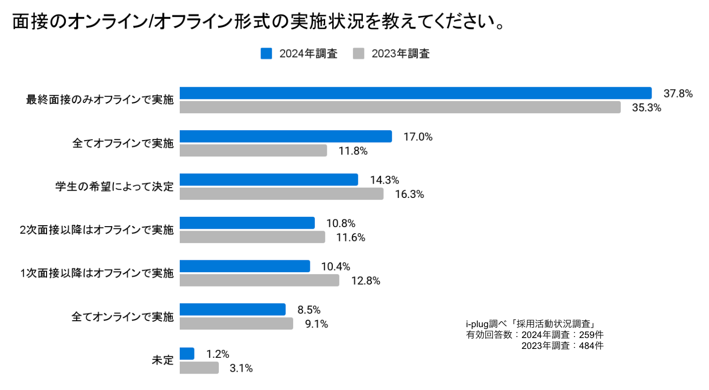 企業を対象に実施したアンケートでは「面接のオンライン/オフライン形式の実施状況」に関する設問は、「最終面接のみオフラインで実施」と回答した企業が最多の37.8%。上記の設問で、25卒学生も「最終面接のみ対面を希望」の回答が最多であったことから、双方のニーズが一致していることがわかります。