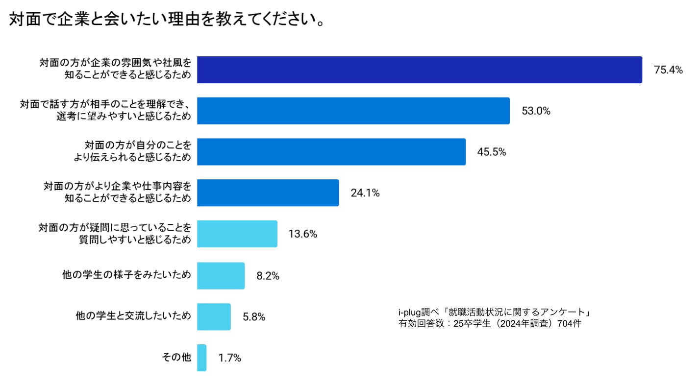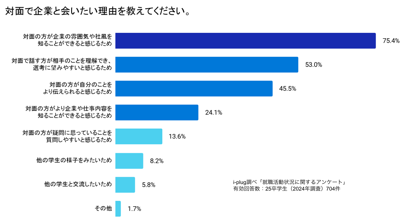 「対面の方が企業の雰囲気や社風を知ることができると感じるため」が最多の75.4%でした。次いで「対面で話す方が相手のことを理解でき、選考に望みやすいと感じるため」が53.0%。25卒学生は就職活動を進めるうえで、対面で知ることができる情報や、理解できる情報を収集したいことが推測できます。