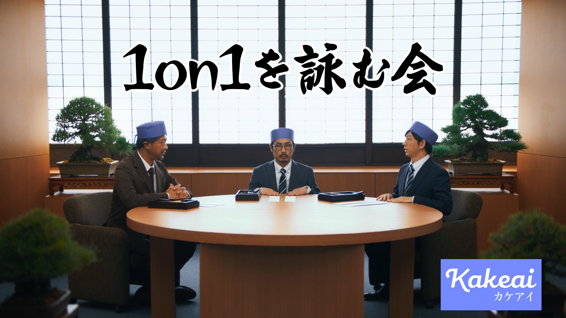 会議室で上司・部下・人事が「1on1を詠む会」で対峙します。パンサーの向井さん演じる部下、尾形さん演じる上司、菅さん演じる人事がそれぞれの日頃の1on1での思いや本音を川柳で詠みあげます。立場の異なる3人の川柳バトルにご注目ください。