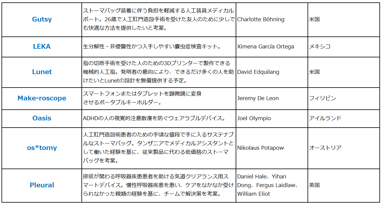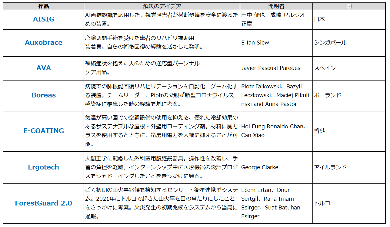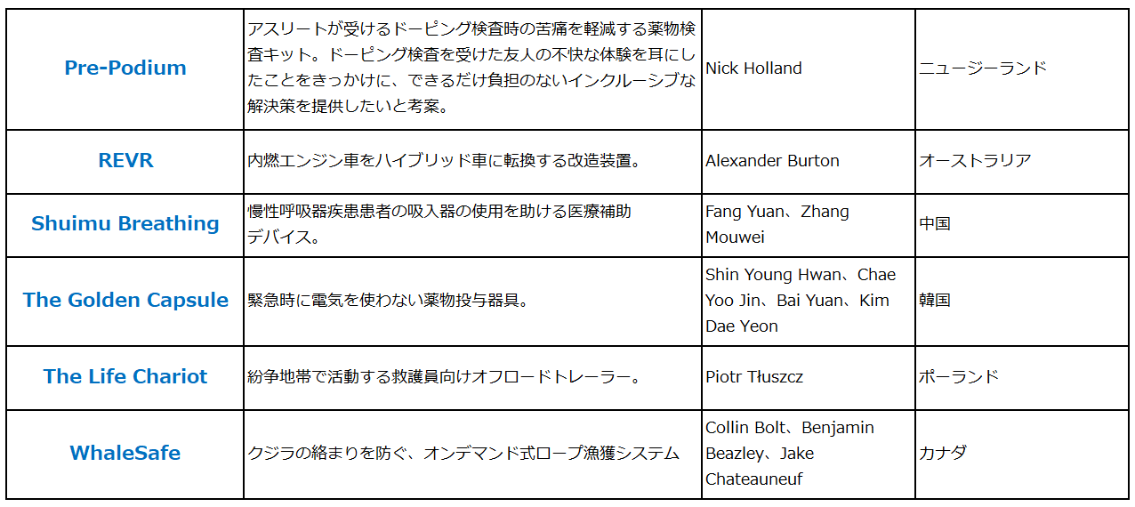 国際トップ20作品に関し、テクノロジー開発部門の責任者であるレイチェル ピンク(Rachel Pink)は次のように述べています。 「発明家は、自身のアイデアがどのように機能するかを十分理解していることを証明する必要があります。自分のアイデアをいかに確実な方法で実現できるのか、実装した場合に直面する課題をどのように解決するのか、その考えを示さなければなりません。選出した優秀作品のいくつかには、デザインプロセスの途中で失敗し、その失敗から学んでデザイン精度を上げた過程が見受けられました。」