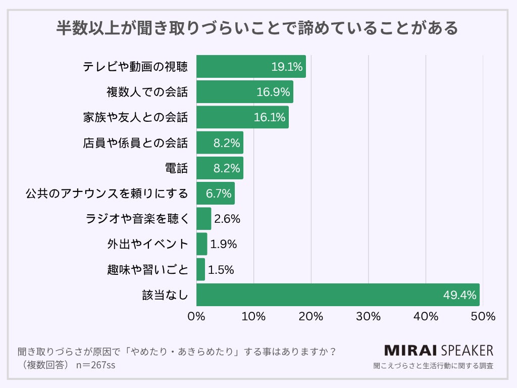 約半数の人が“聞こえづらさが原因で何かをあきらめた経験がある”と回答。「テレビ視聴」「複数人での会話」「家族や友人との会話」が上位を占めました。
