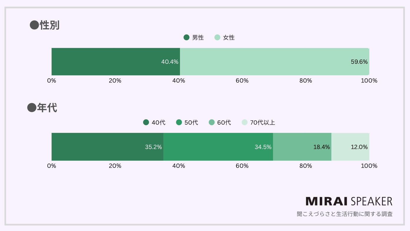 「100年の人生をテクノロジーで豊かにする」という想いのもと、テクノロジーの力で、誰もが明るく前向きに暮らせる社会づくりをめざす株式会社ミライスピーカー(所在地:東京都中央区、代表取締役社長:山地浩、以下「当社」)は、聞こえづらさと生活行動に関する調査を、全国の40歳以上の男女267名に対して実施し、その結果を発表しました。