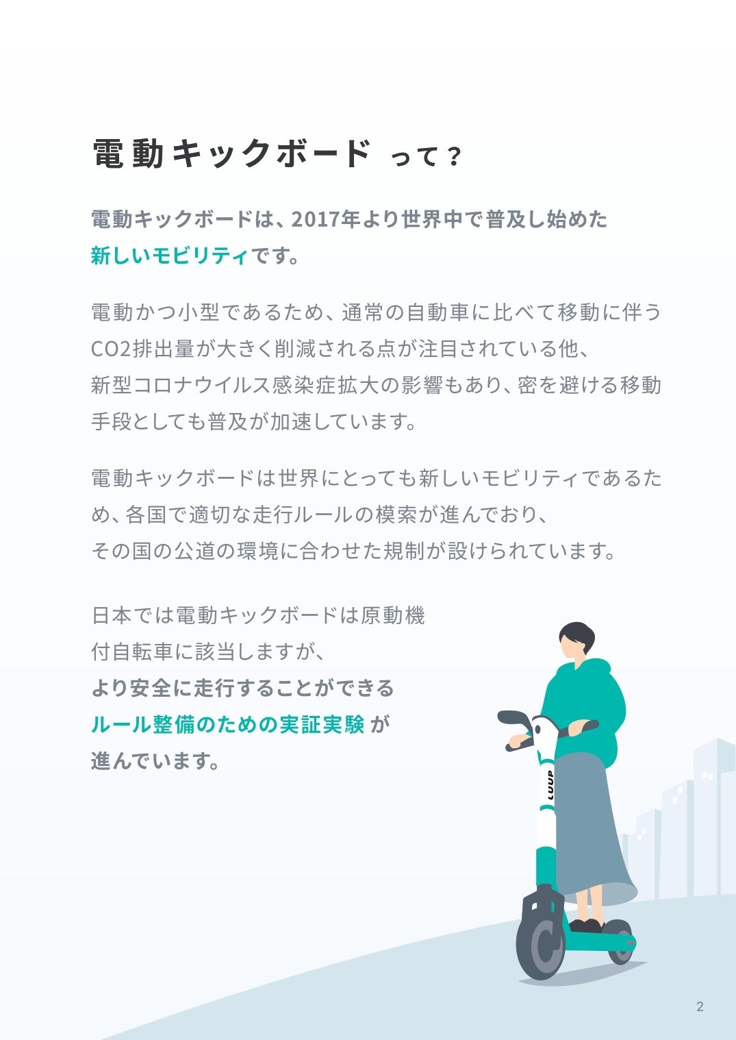 Luupは、人と乗り物と街、それらすべてが共生できる社会の実現を目指し、電動マイクロモビリティの安全で有意義な社会実装に向けて、さまざまな取り組みを行っています。Luupが目指す未来、実施してきた実証実験の背景と、安全への取り組みについて一挙にご紹介します。