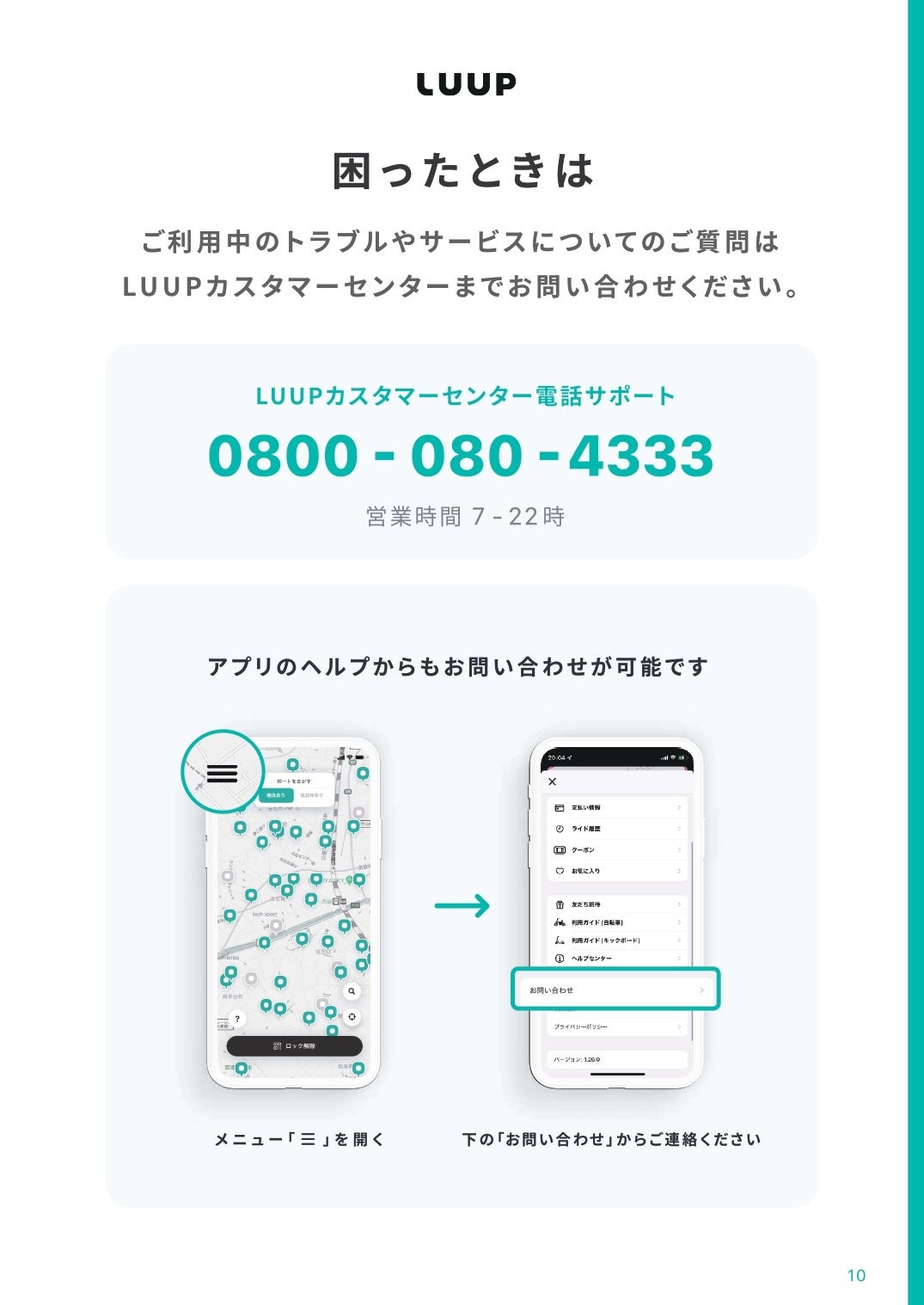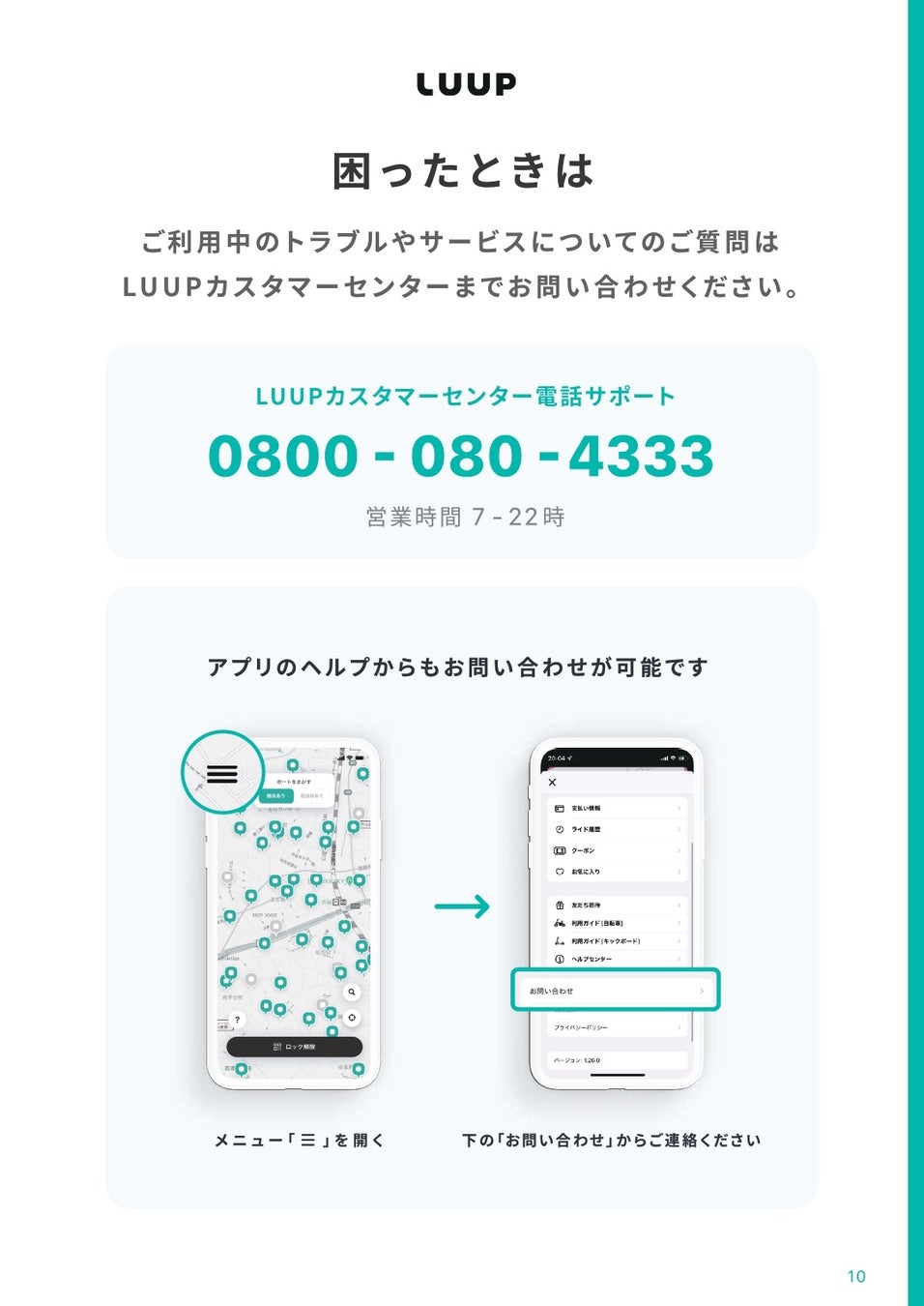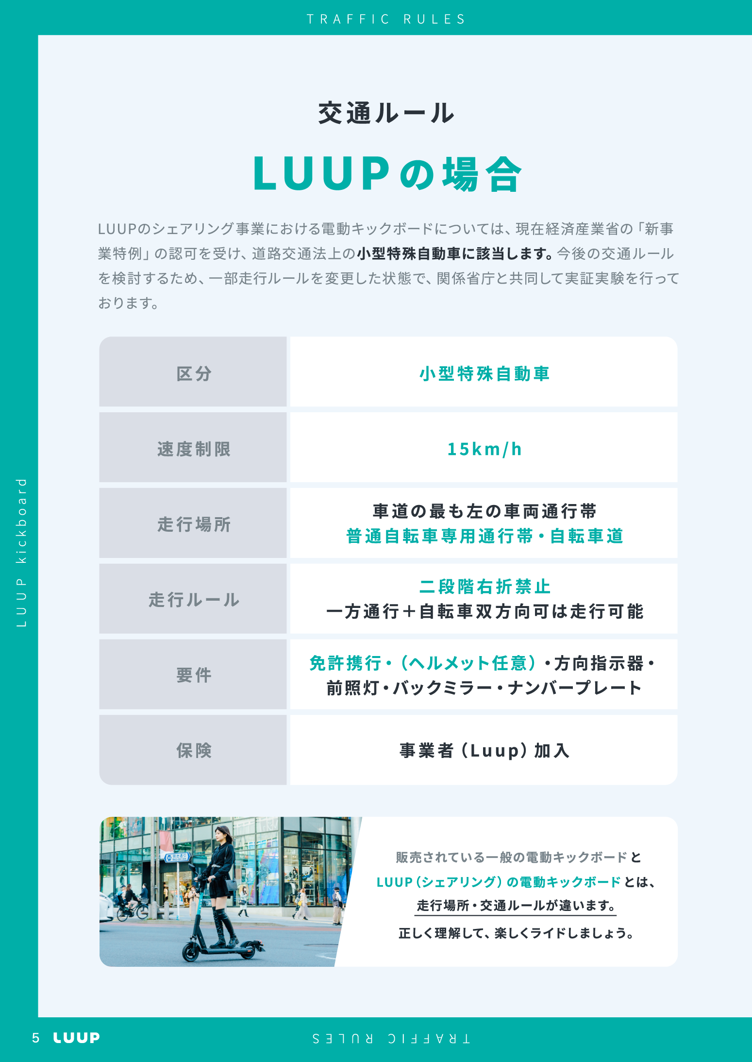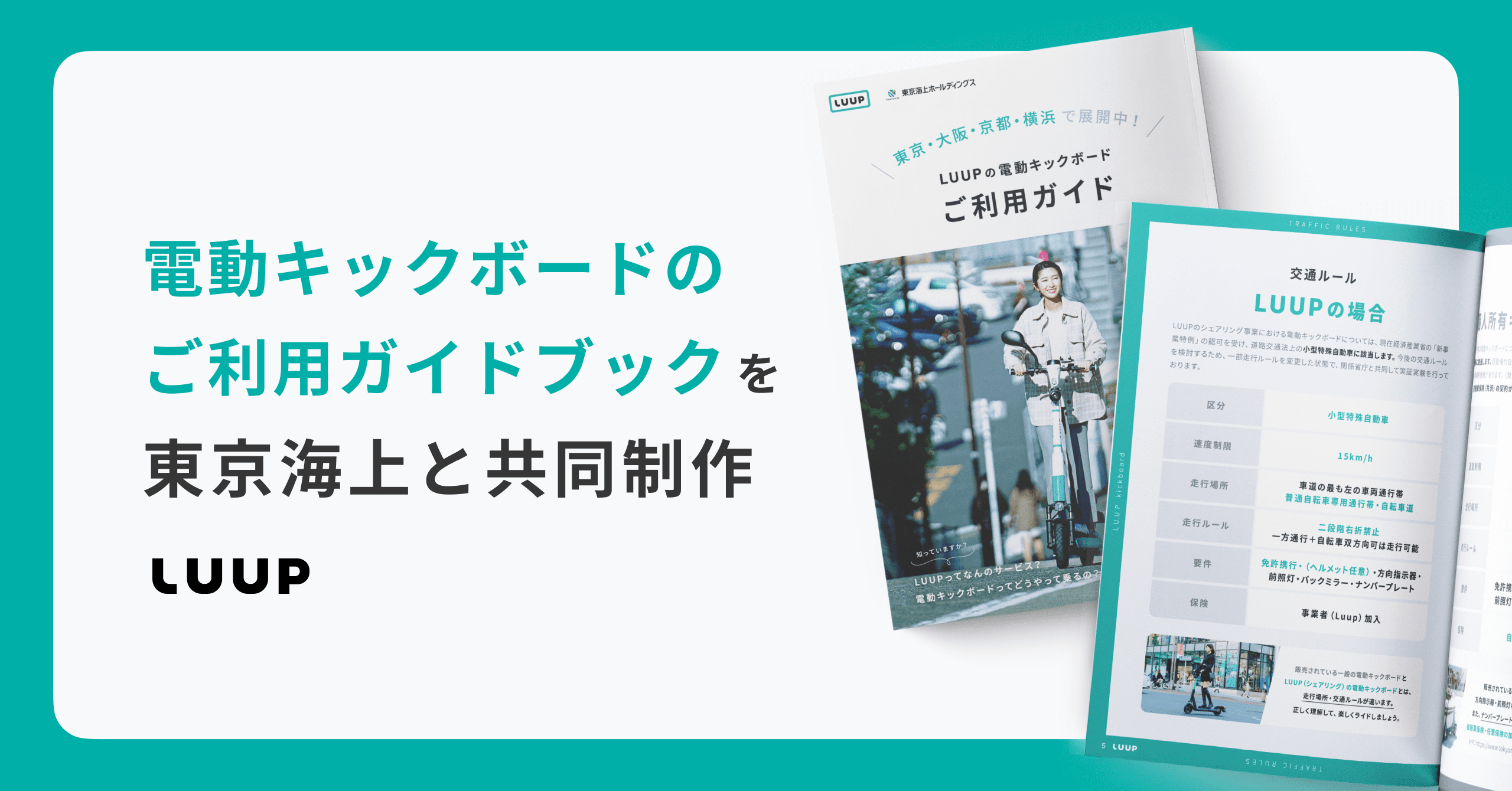 株式会社Luup(本社:東京都渋谷区、代表取締役社長兼CEO:岡井大輝、以下「Luup」)は、東京海上ホールディングス株式会社(本社:東京都千代田区、取締役社長グループCEO:小宮暁、以下「東京海上」)と共同で、電動キックボードの基本情報や走行ルール、走行時の注意事項等を理解いただき、安全に利用いただくための「電動キックボード ご利用ガイドブック」を制作しました。本ガイドブックは、本日より全ページをWeb上で公開するほか、今後実施する安全講習会等の場で参加者の皆様へ配布し、電動キックボードの安全な走行ルールの周知徹底に努めます。