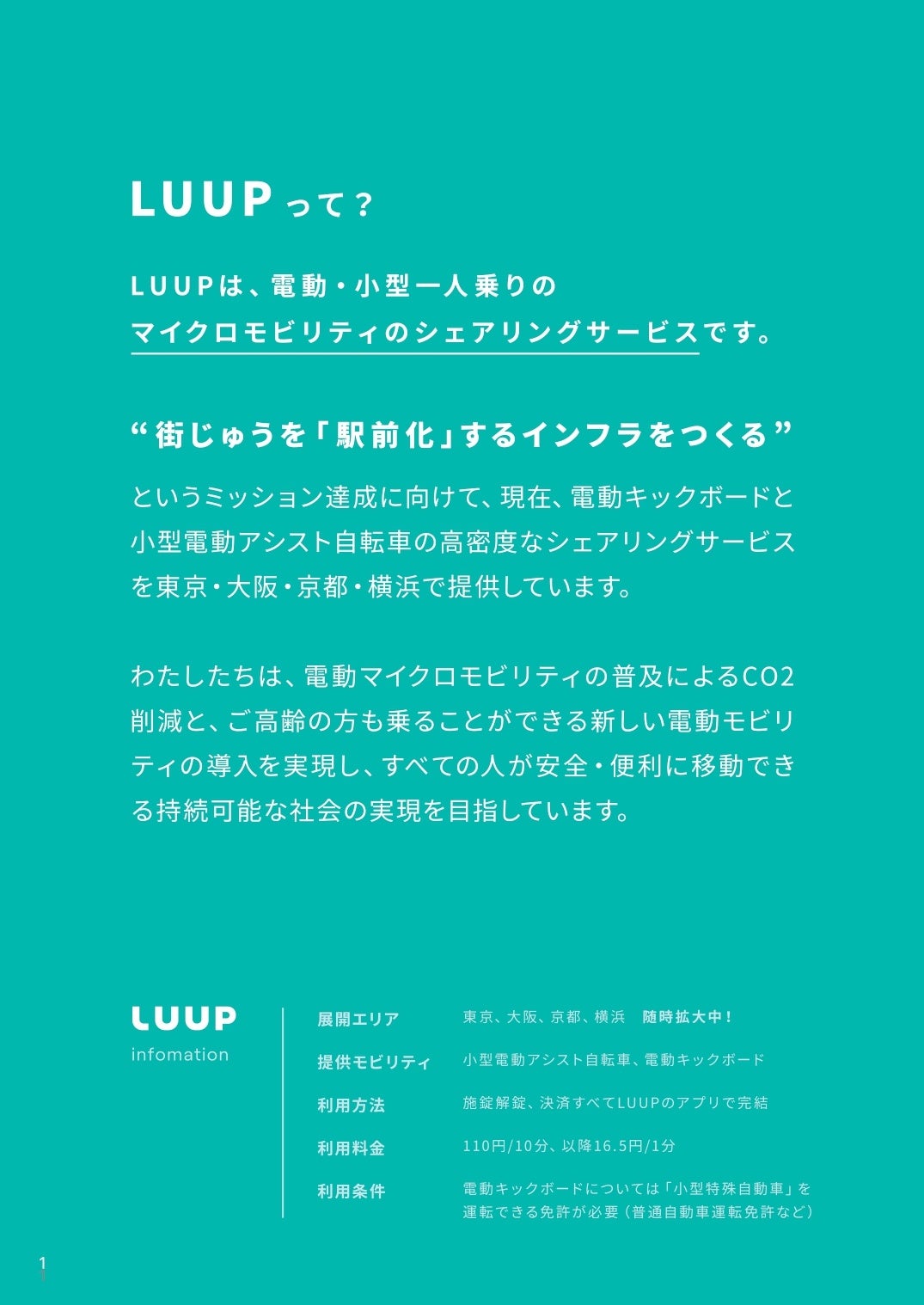 株式会社Luupは、電動・小型・一人乗りのマイクロモビリティのシェアリングサービスを通して、街じゅうを「駅前化」する新しい短距離移動インフラをつくります。現在、電動キックボードと小型電動アシスト自転車の高密度なシェアリングサービスを東京・大阪・京都・横浜で提供しています。電動マイクロモビリティの普及によるCO2削減と、ご高齢の方も乗ることができる新しい電動モビリティの導入を実現し、すべての人が安全・便利に移動できる持続可能な社会をつくります。