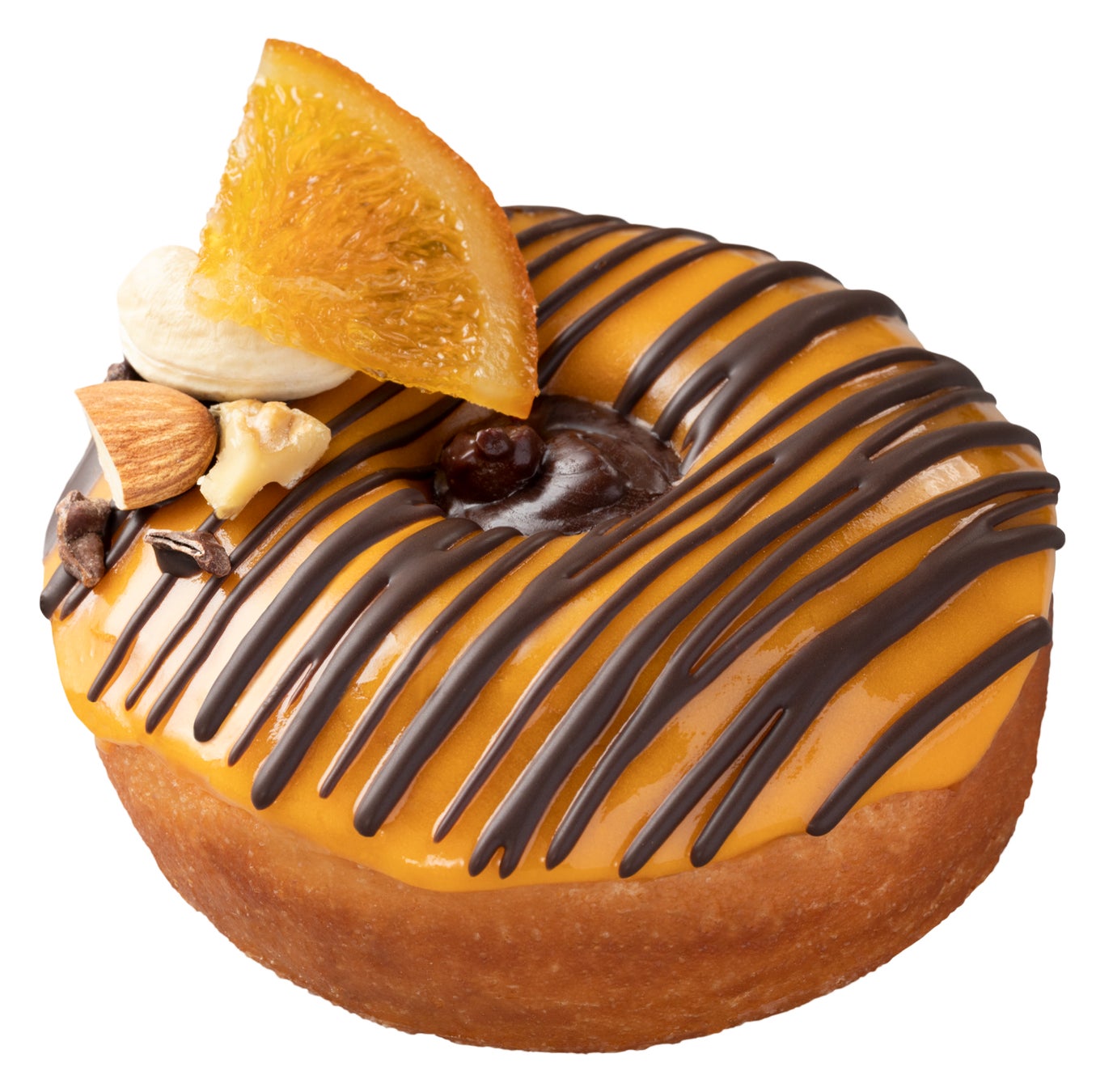 オレンジグレーズの上にはビターなチョコレートのライン、中央には果実味が後を引く美味しさのオレンジピールを入れた生チョコレート風フィリングを絞りました。3種のナッツがアクセントとなり、トッピングのドライオレンジと合わせてオレンジの風味をトリプルで味わえます。
