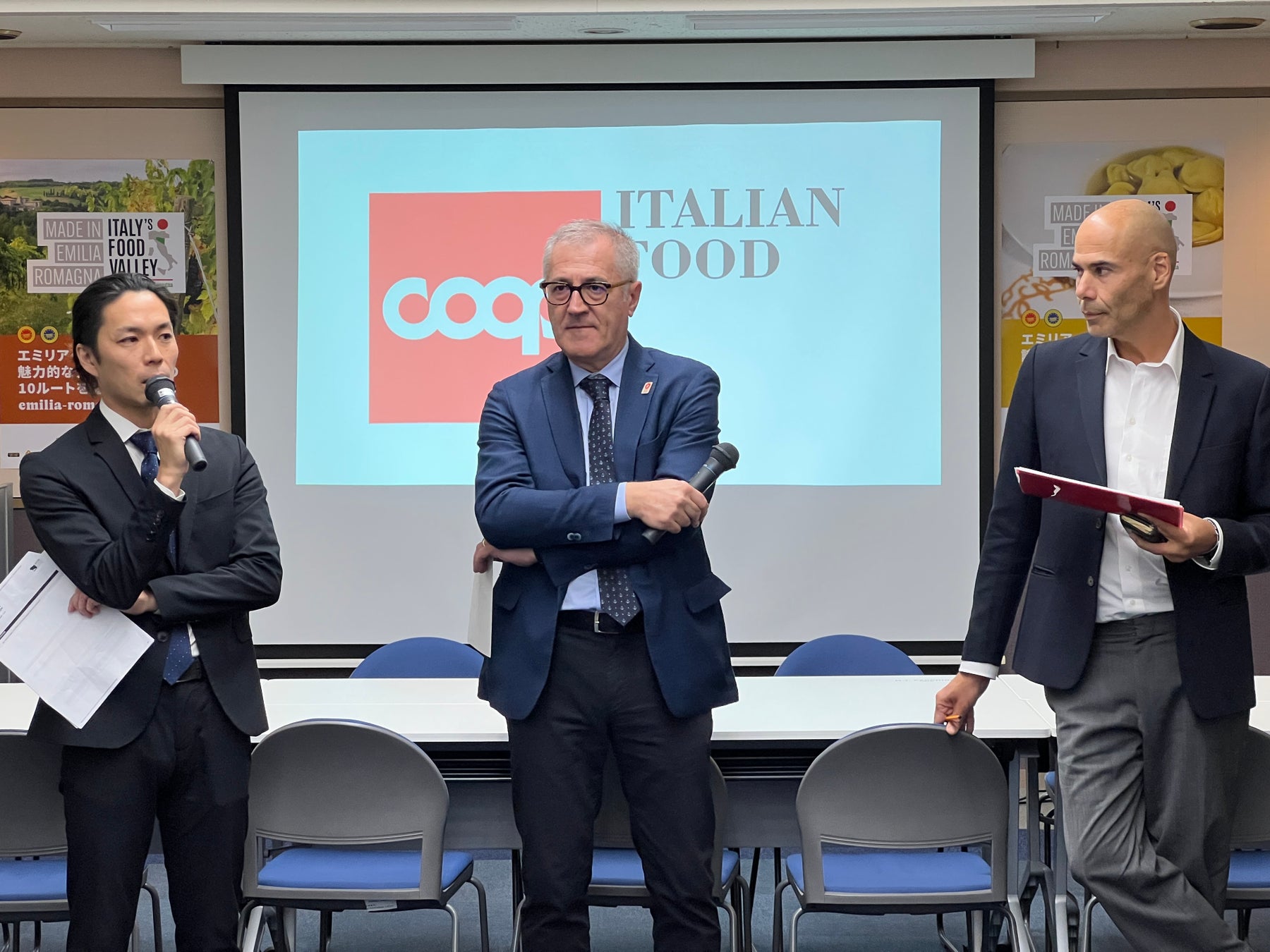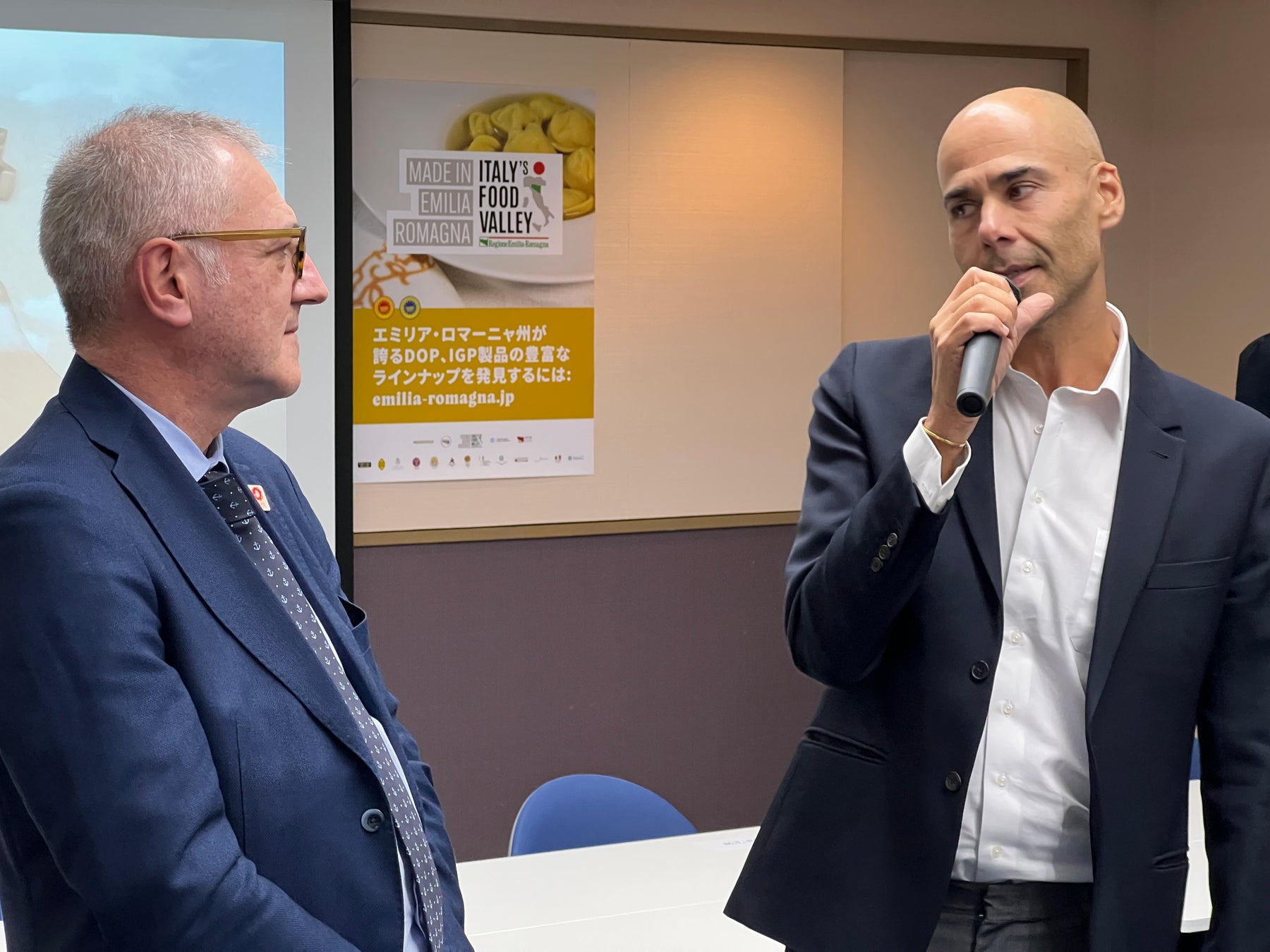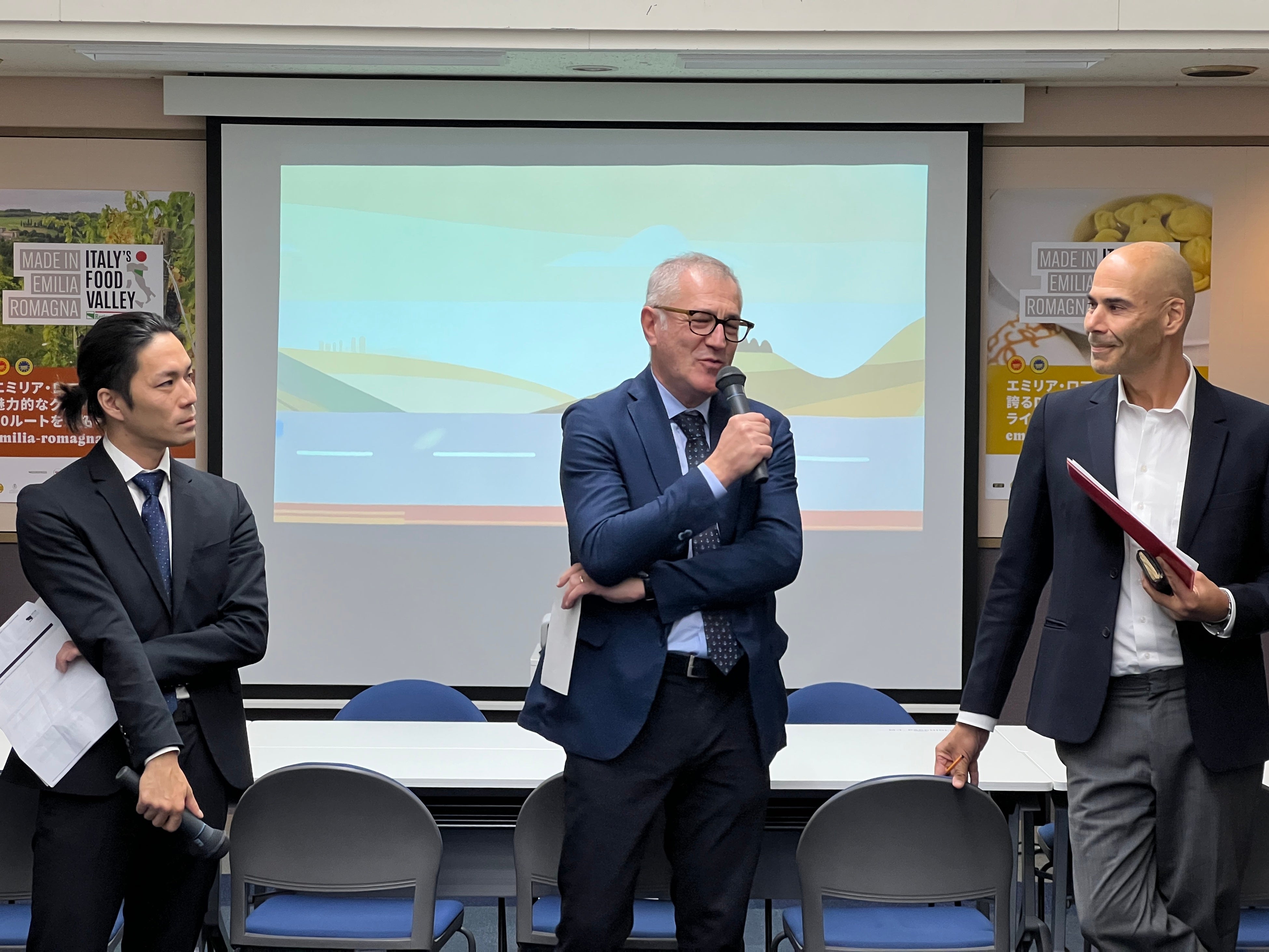 在日イタリア商工会議所は、11月16日(木)、イタリアの美食の宝庫・エミリア・ロマーニャ州経済視察団来日を記念したBtoBイベントを、大阪市中央区のマイドームおおさかにて開催しました。世界イタリア料理週間(11月13日~19日開催)事業の一環として、イタリアを代表する美食の宝庫として名高いエミリア・ロマーニャ州からステファノ・ボナッチーニ州知事、同州経済開発・グリーン経済・労働・研修担当会議員のヴィンチェンツォ・コッラ氏、そして同州農業・農業食品・狩猟・漁業会議員のアレッシオ・マンミ氏や初めとする政府要人の他に食品関係企業の代表者らが約80名来日。