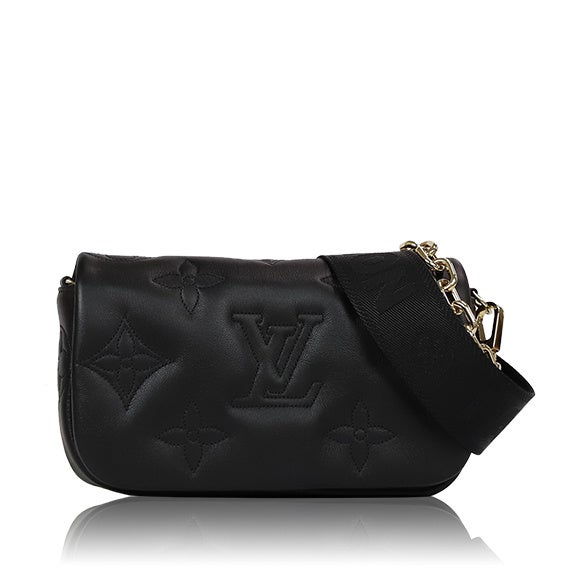 ルイ・ヴィトンのウォレットオンストラップは、ブラックのキルティング加工された柔らかなレザーに、エンボス加工で表現された大きなLVロゴとモノグラム・フラワーが特徴的な小型ショルダーバッグです。幅広のファブリック製ショルダーストラップと、華やかなゴールドトーンのチェーンが付属し、スタイルに合わせて持ち方を変えられます。ふっくらとした質感と上品なデザインが、装いにアクセントを加えます。