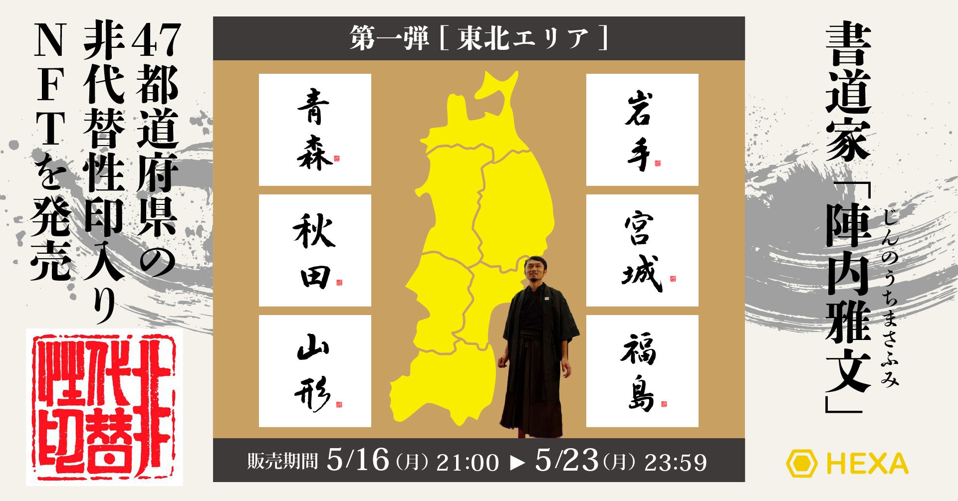 NFTマーケット「HEXA(ヘキサ)」では、書道家「陣内雅文」の47都道府県の書を非代替性印(NFT)としてエリア別に販売します。第一弾は東北エリアの計6県の書を5/16(月)から販売開始します。