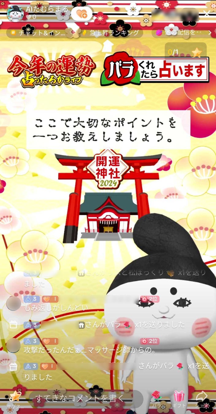 TikTokでギフトを送ってくださったリスナーの方には、「AIたむらまろ」が直接運勢を占いました。占い師監修の占いで一人ひとりの運勢を占い、リスナーの名前を呼びながら2024年の運気を上げるアドバイスをお伝え。いつもとはちょっと違う占い師モードのマロの本格占いで配信を盛り上げました。