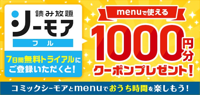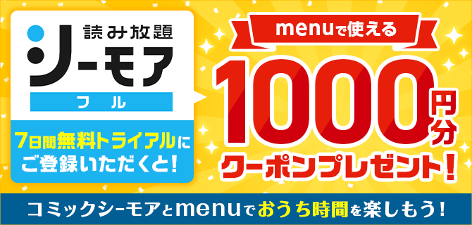 【キャンペーン内容】コミックシーモアの読み放題フルに初回登録いただいた方を対象に、menuで使える1,000円分のクーポンをプレゼントいたします。