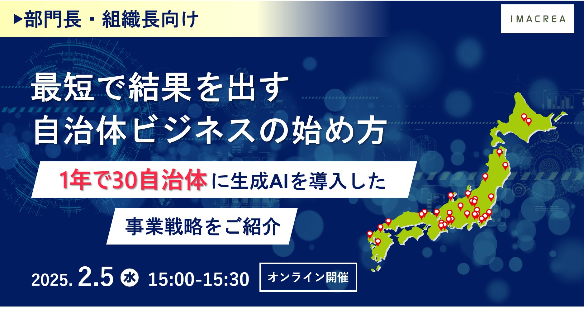 当社は、2024年1月30日に発表(https://www.imacrea.co.jp/20240130-2/)した自治体向け生成AIサービス「exaBase 生成AI for 自治体」を、僅か1年で30自治体に導入しました。本セミナーでは、自治体に販路を拡大しようと悩んでいる企業向けに、この一年間の私たちの取り組みの成功事例を余すことなくお伝えします。