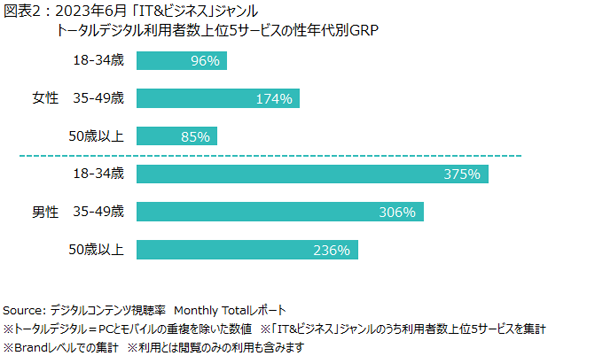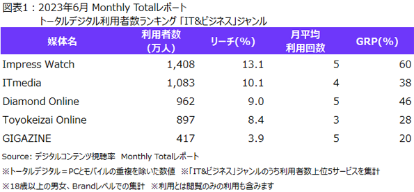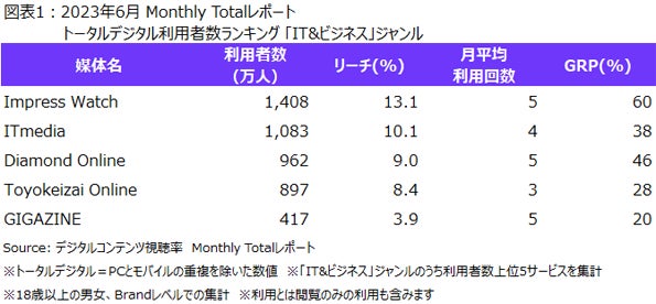 2023年6月のニールセン デジタルコンテンツ視聴率 Monthly Totalレポートによると、「IT&ビジネス」ジャンルにおいて、PCとモバイルの重複を除いたトータルデジタルの利用者数が最も多かったのは「Impress Watch」で1,408万人が利用しており、「ITmedia」が1,083万人で続いていました。また、GRPでは、「Impress Watch」が60%と最も高く、「Diamond Online」が46%で続いていました(図表1)。