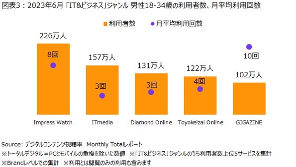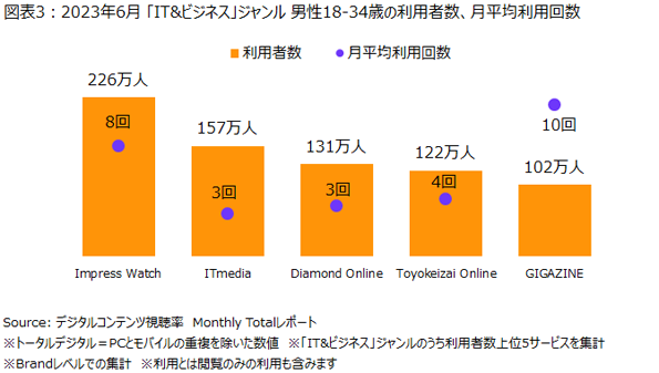 最後に、ターゲットGRP(TARP)が最も高かった男性18-34歳の利用状況をサービス別に見ると、利用者数は全年代の結果と同様に「Impress Watch」が226万人で最も多く、次いで「ITmedia」が157万人となっていました。また、月平均利用回数では「GIGAZINE」が10回で最も多く、「Impress Watch」が8回で続いていました(図表3)。