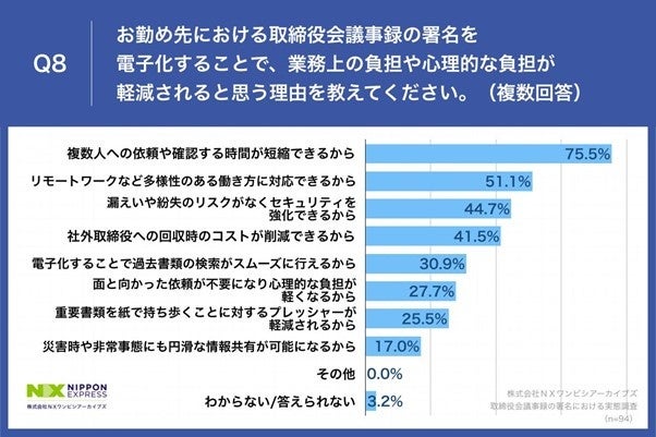 Q7で「非常にそう思う」「ややそう思う」と回答した方に、「Q8.お勤め先における取締役会議事録の署名を電子化することで、業務上の負担や心理的な負担が軽減されると思う理由を教えてください。(複数回答)」(n=94)と質問したところ、「複数人への依頼や確認する時間が短縮できるから」が75.5%、「リモートワークなど多様性のある働き方に対応できるから」が51.1%、「漏えいや紛失のリスクがなくセキュリティを強化できるから」が44.7%という回答となりました。