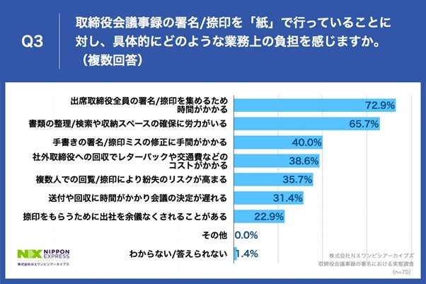 Q2で「とてもある」「ややある」と回答した方に、「Q3.取締役会議事録の署名/捺印を「紙」で行っていることに対し、具体的にどのような業務上の負担を感じますか。(複数回答)」(n=70)と質問したところ、「出席取締役全員の署名/捺印を集めるため時間がかかる」が72.9%、「書類の整理/検索や収納スペースの確保に労力がいる」が65.7%、「手書きの署名/捺印ミスの修正に手間がかかる」が40.0%という回答となりました。