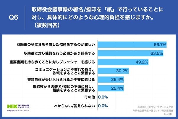 Q5で「とてもある」「ややある」と回答した方に、「Q6.取締役会議事録の署名/捺印を「紙」で行っていることに対し、具体的にどのような心理的負担を感じますか。(複数回答)」(n=63)と質問したところ、「取締役の多忙さを考慮した依頼をするのが難しい」が66.7%、「取締役に対し催促を行う必要があり辟易する」が63.5%、「重要書類を持ち歩くことに対しプレッシャーを感じる」が49.2%という回答となりました。