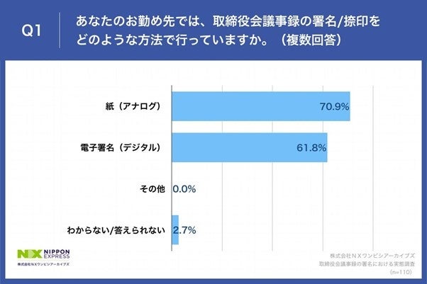 「Q1.あなたのお勤め先では、取締役会議事録の署名/捺印をどのような方法で行っていますか。(複数回答)」(n=110)と質問したところ、「紙(アナログ)」が70.9%、「電子署名(デジタル)」が61.8%という回答となりました。