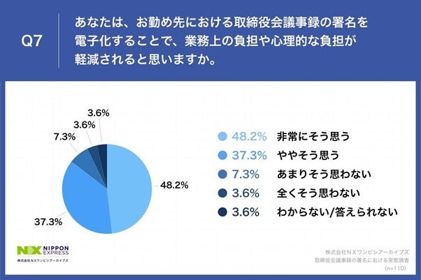 「Q7.あなたは、お勤め先における取締役会議事録の署名を電子化することで、業務上の負担や心理的な負担が軽減されると思いますか。」(n=110)と質問したところ、「非常にそう思う」が48.2%、「ややそう思う」が37.3%という回答となりました。
