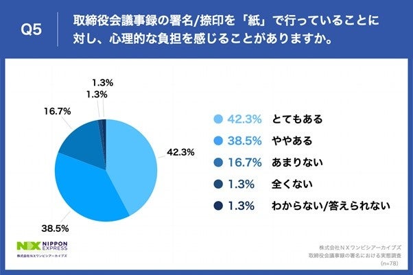 Q1で「紙(アナログ)」と回答した方に、「Q5.取締役会議事録の署名/捺印を「紙」で行っていることに対し、心理的な負担を感じることがありますか。」(n=78)と質問したところ、「とてもある」が42.3%、「ややある」が38.5%という回答となりました。