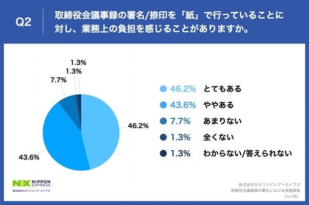 Q1で「紙(アナログ)」と回答した方に、「Q2.取締役会議事録の署名/捺印を「紙」で行っていることに対し、業務上の負担を感じることがありますか。」(n=78)と質問したところ、「とてもある」が46.2%、「ややある」が43.6%という回答となりました。