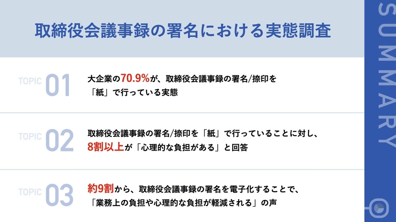【取締役会議事録の署名、アナログ?デジタル?】大企業の70.9%が「紙」で署名/捺印の実態!「取締役の多忙さを考慮した依頼が困難」など、心理的負担を実感する声多数