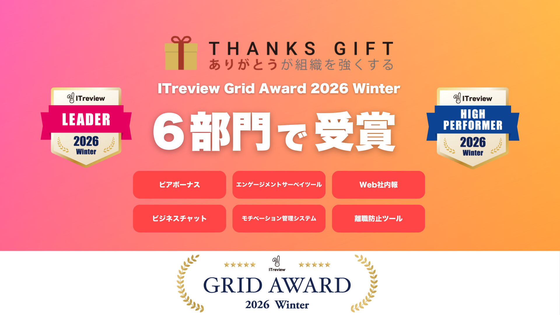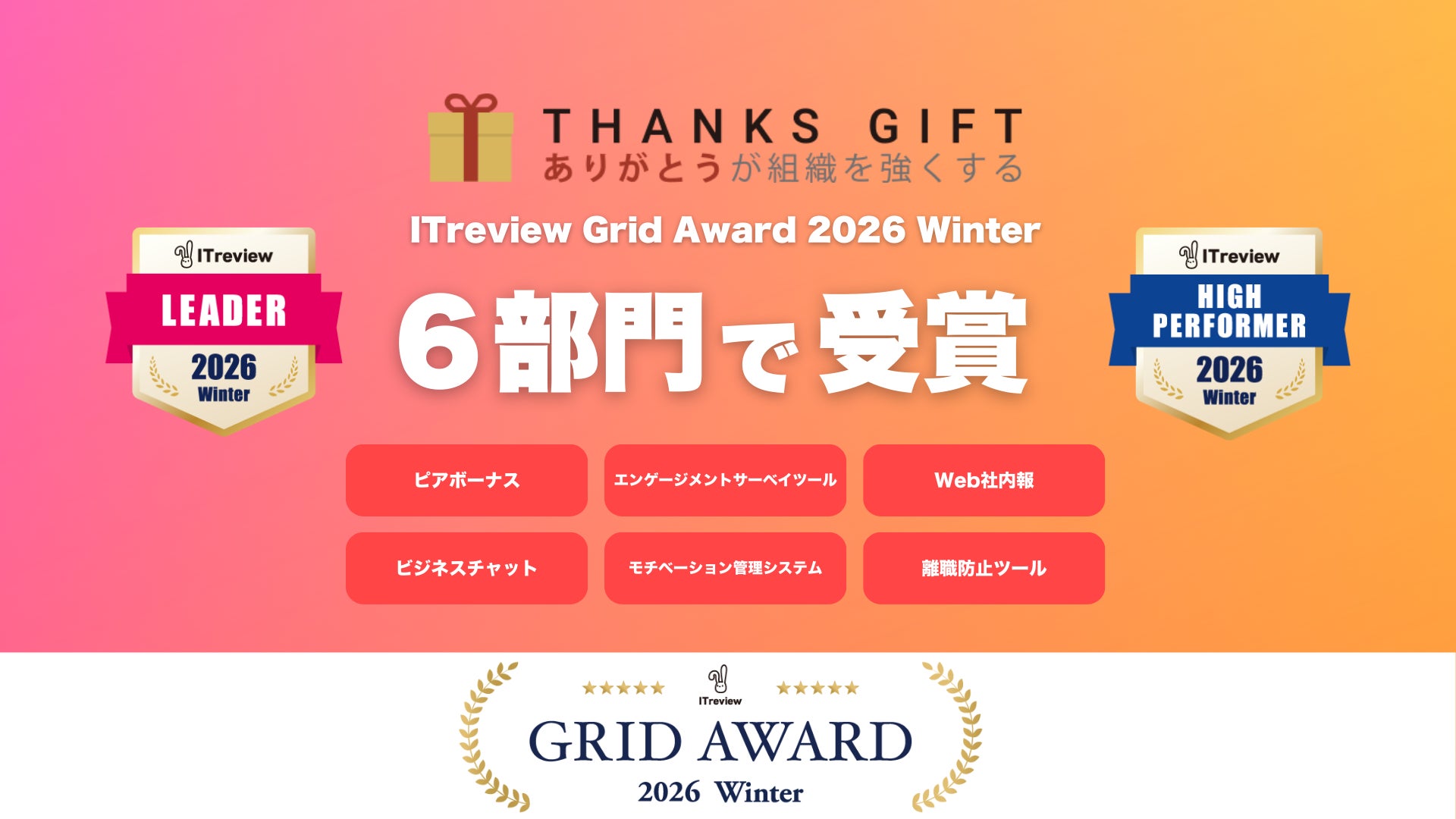 株式会社Take Action(本社:東京都品川区、代表取締役:成田 靖也)が運営する組織改善プラットフォーム「THANKS GIFT」が、「ITreview Grid Award 2026 Winter」の6部門で「Leader」「High performer」を受賞いたしました。