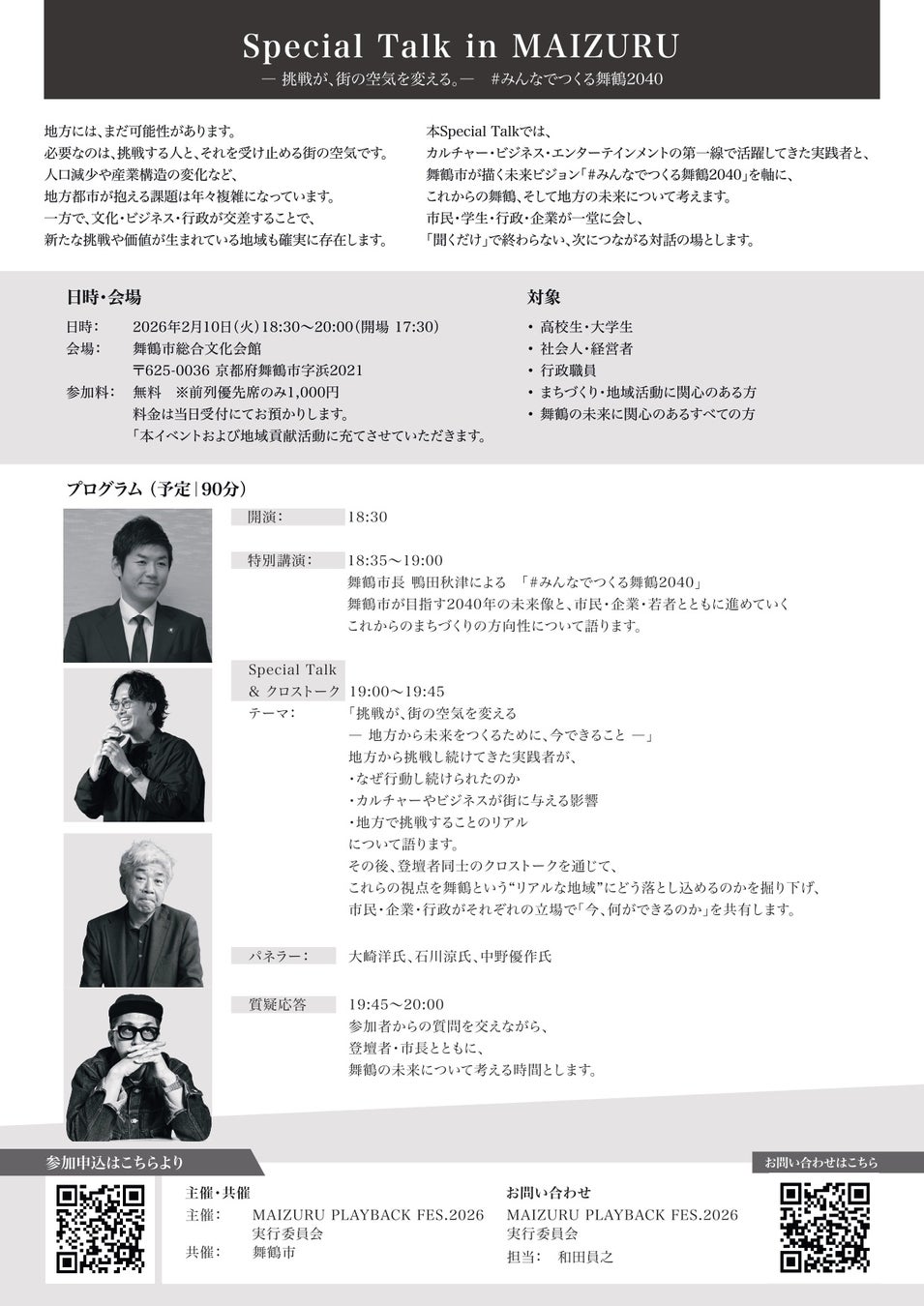 2026年2月10日(火)、舞鶴市総合文化会館にて、カルチャー・ビジネス・エンターテインメントの第一線で活躍する実践者を招いた特別講演会「Special Talk in MAIZURU #みんなでつくる舞鶴2040」を開催します。地方都市を取り巻く環境が変化する中、市民・企業・行政が共に2040年の未来を考える機会を創出します。