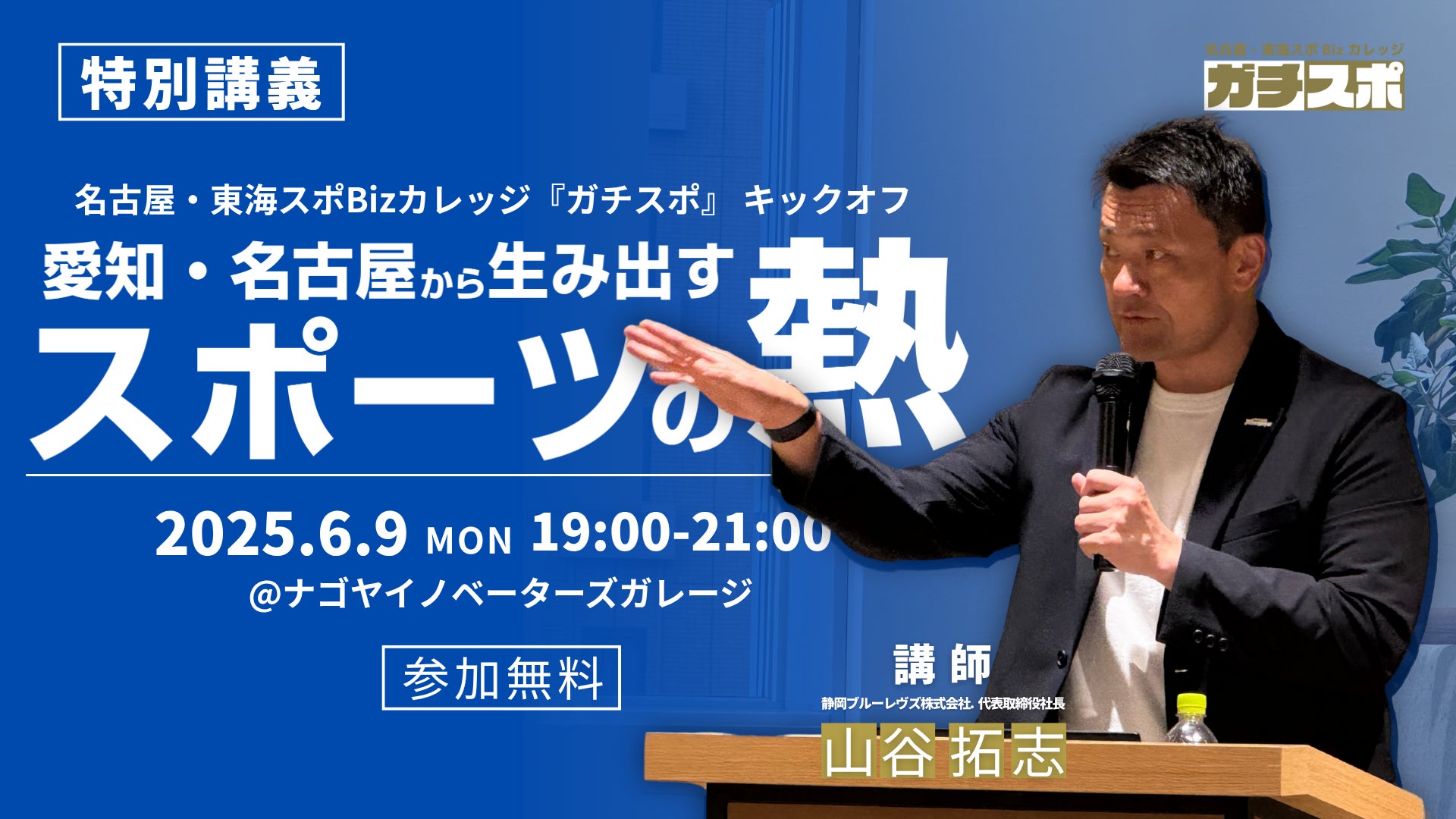 ガチスポの1期から4期まで、講師としてご登壇くださっている静岡ブルーレヴズ株式会社代表取締役社長 山谷 拓志 氏に加えて、(公財)愛知・名古屋アジア・アジアパラ競技大会組織委員会 競技会場第三課長 今枝 慎一 氏にご登壇いただきました。