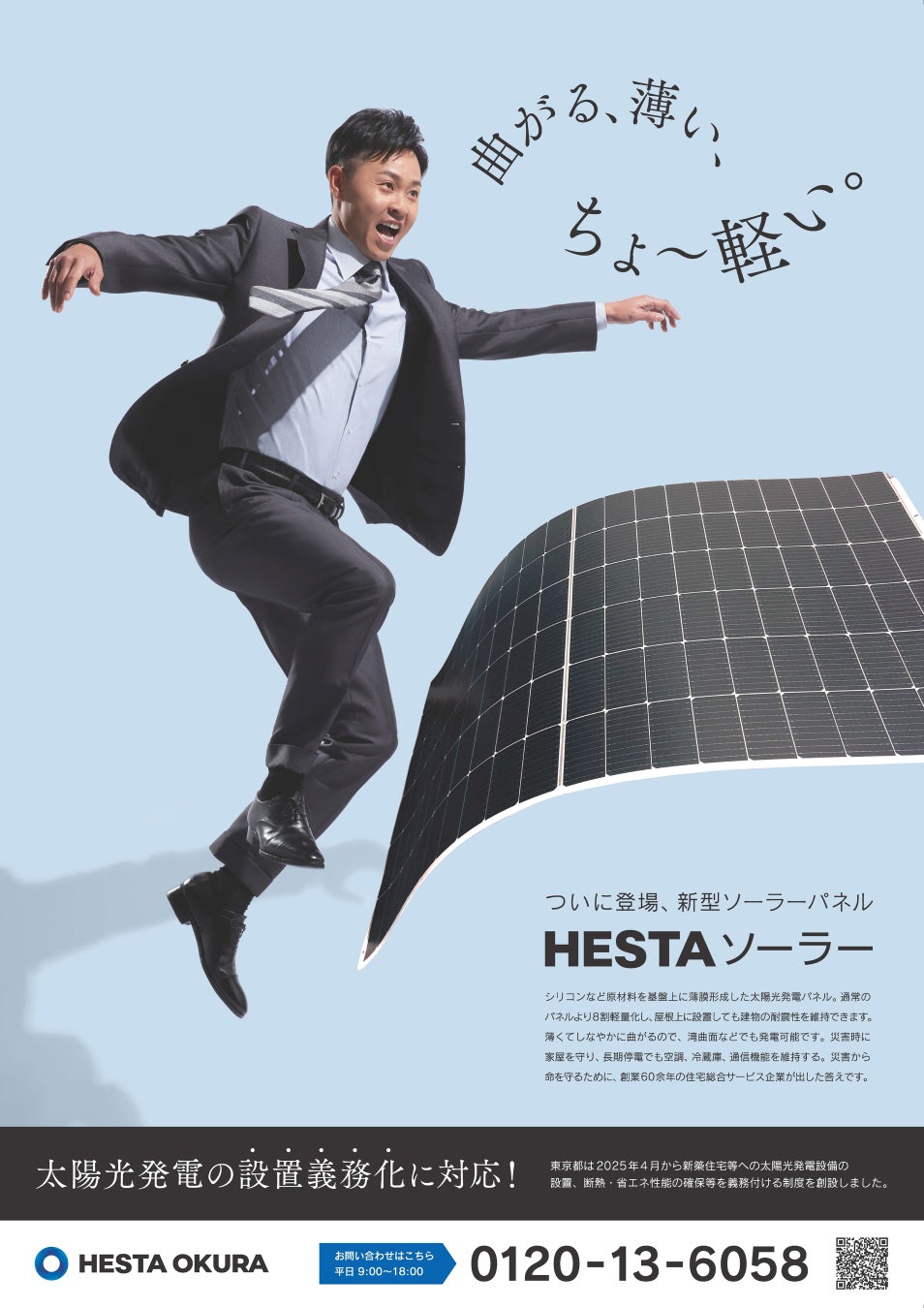 株式会社HESTA大倉(本社:東京都千代田区、代表取締役社長 鬼塚 友章、以下 HESTA大倉)は、元競泳金メダリストの北島康介氏を起用したHESTA ソーラーの新ポスターを発表いたします。本ポスターでは、北島氏の持つ「挑戦」と「革新」の精神を、新型ソーラーパネルの特長と重ね合わせ、再生可能エネルギーの未来を広く訴求します。