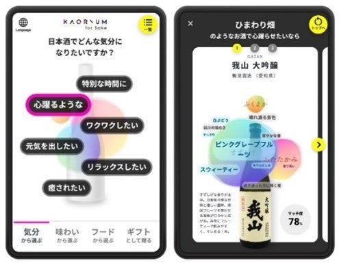 人の感性を日本酒とマッチすることができる日本酒ソムリエ AI は、「癒やされたい」「気合を入れたい」といったなりたい気分や、「個性的」「フルーティ」といった好みの味わいに合わせて、店頭にある日本酒とのマッチ度を計算し、相性の良い日本酒をレコメンドします。この技術により、これまでは経験と感性を持った唎酒師やソムリエだけが可能であった「人の感性にそったお酒選び」という接客体験を小売店の店頭でも可能にします。
