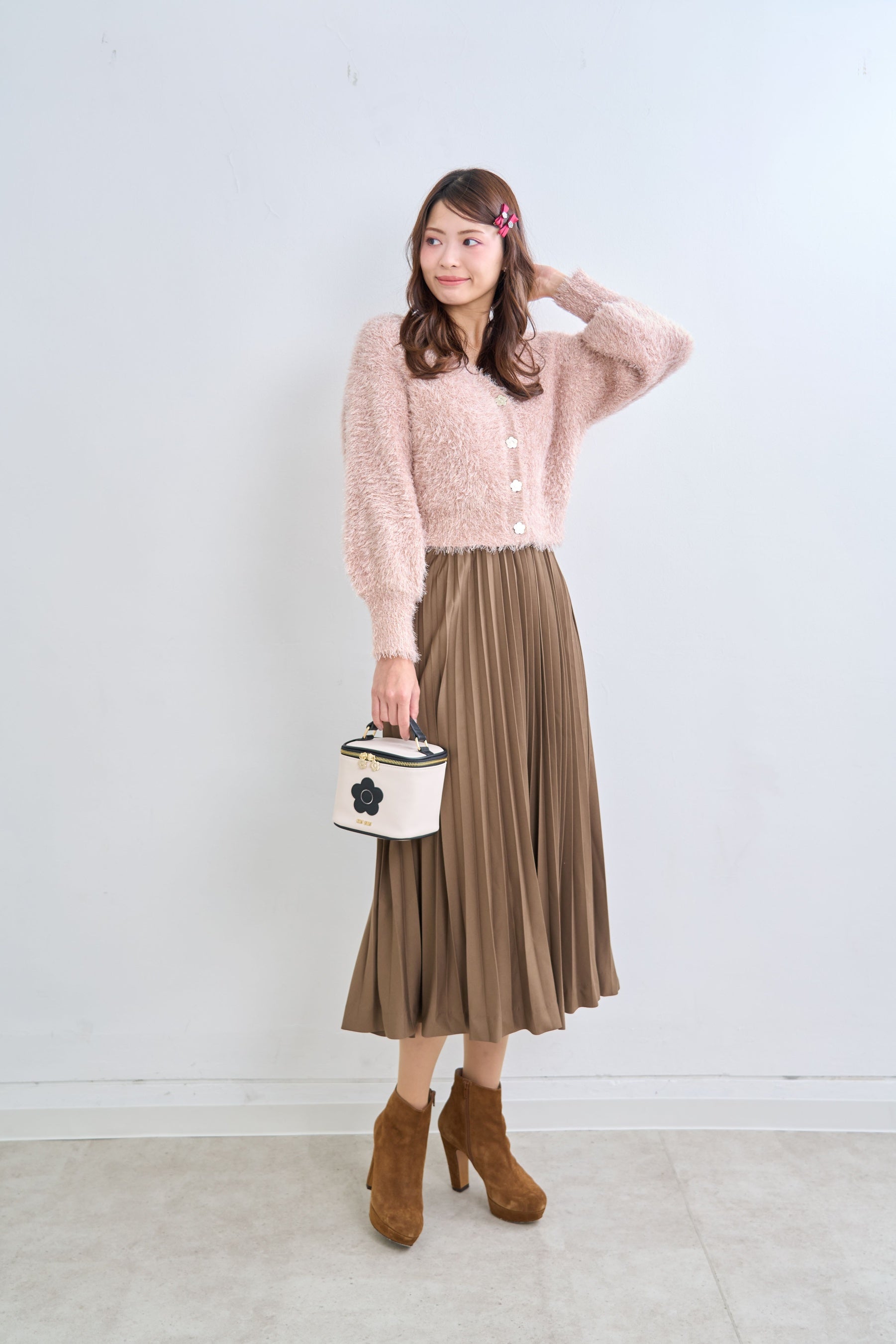 甘い雰囲気のスカートスタイルは、ラメ入りでキラキラしたシャギーが上品に輝く、クロップド丈のニットカーデに、デイジーのバックルが目をひくプリーツロングスカートを合わせて。いずれも肌なじみの良いピンク&ブラウンをセレクトし洒落感のあるコーデに。