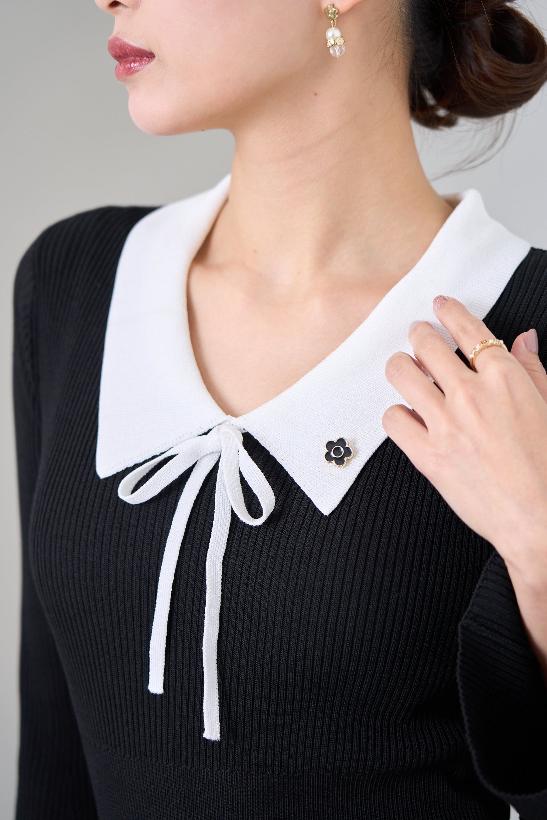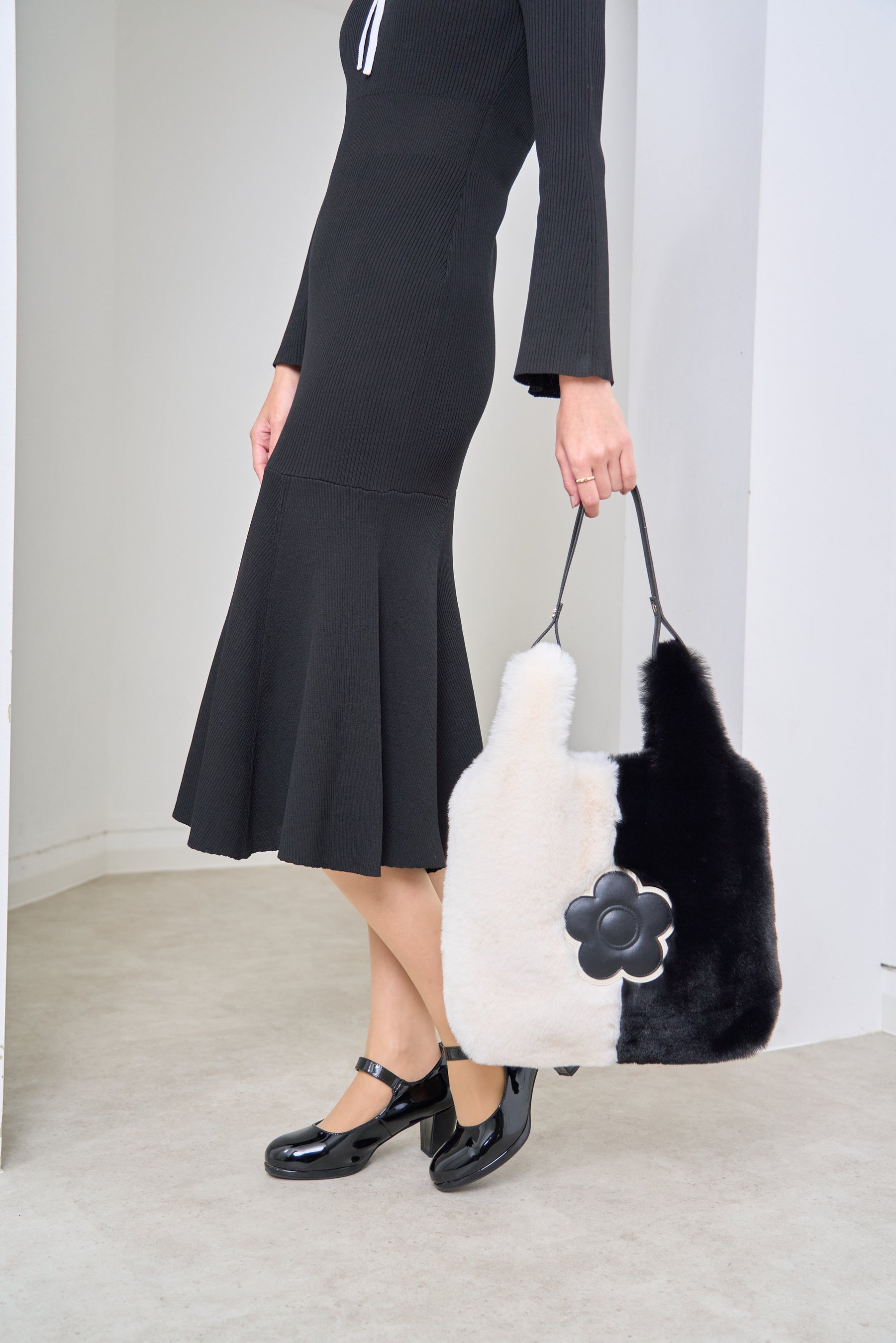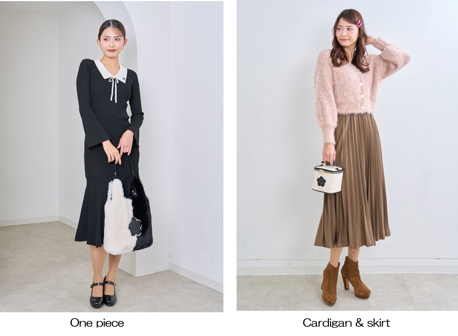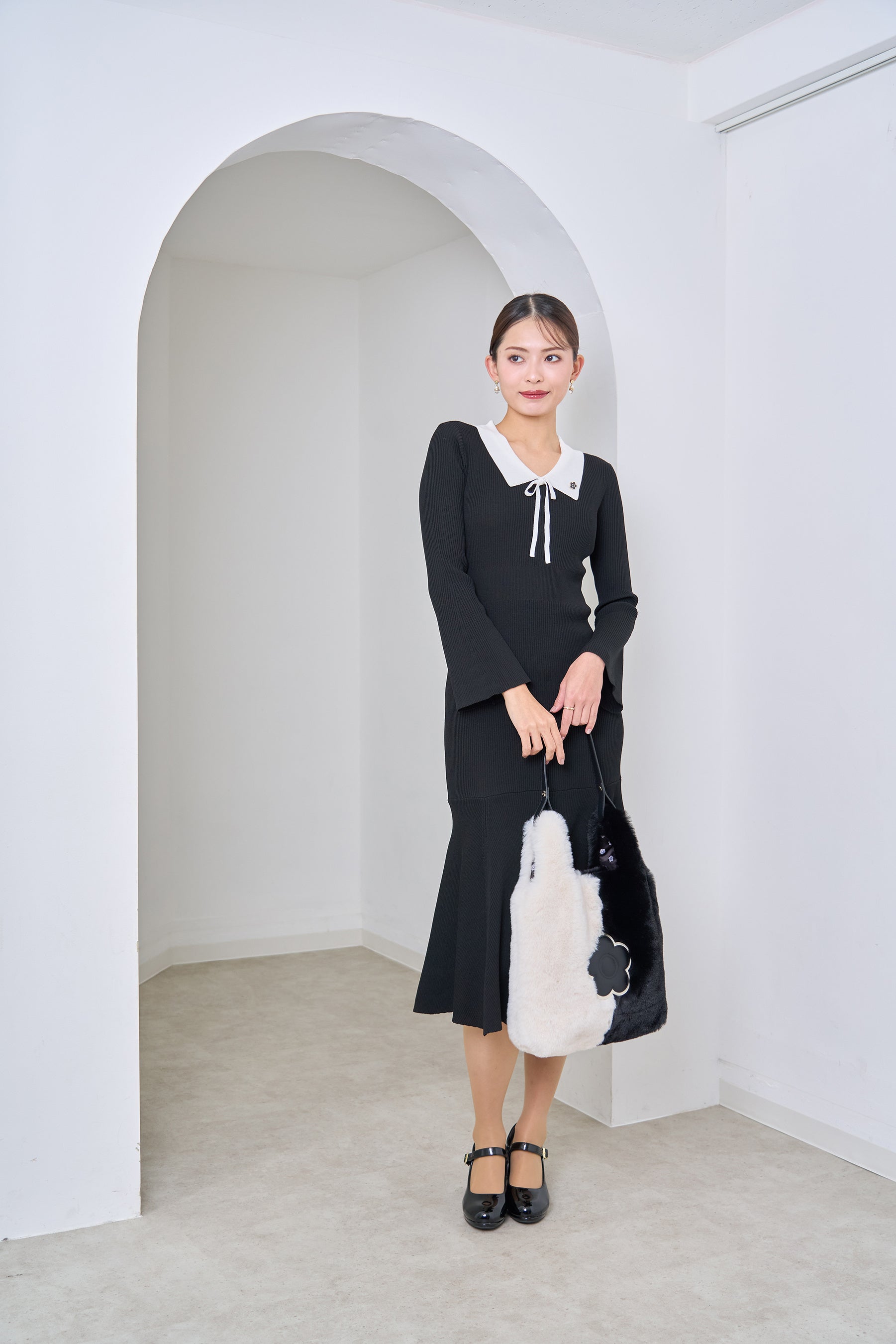 モノトーンでまとめたワンピーススタイル。主役のワンピースは、秋に大好評だったマーメイドラインのニットワンピを冬仕様にアレンジ。ラッフルの長袖と、襟のワンポイントデイジーが印象的。毛足の長いファーを使用したバイカラーの大きめトートと合わせると、カジュアルなムードに。