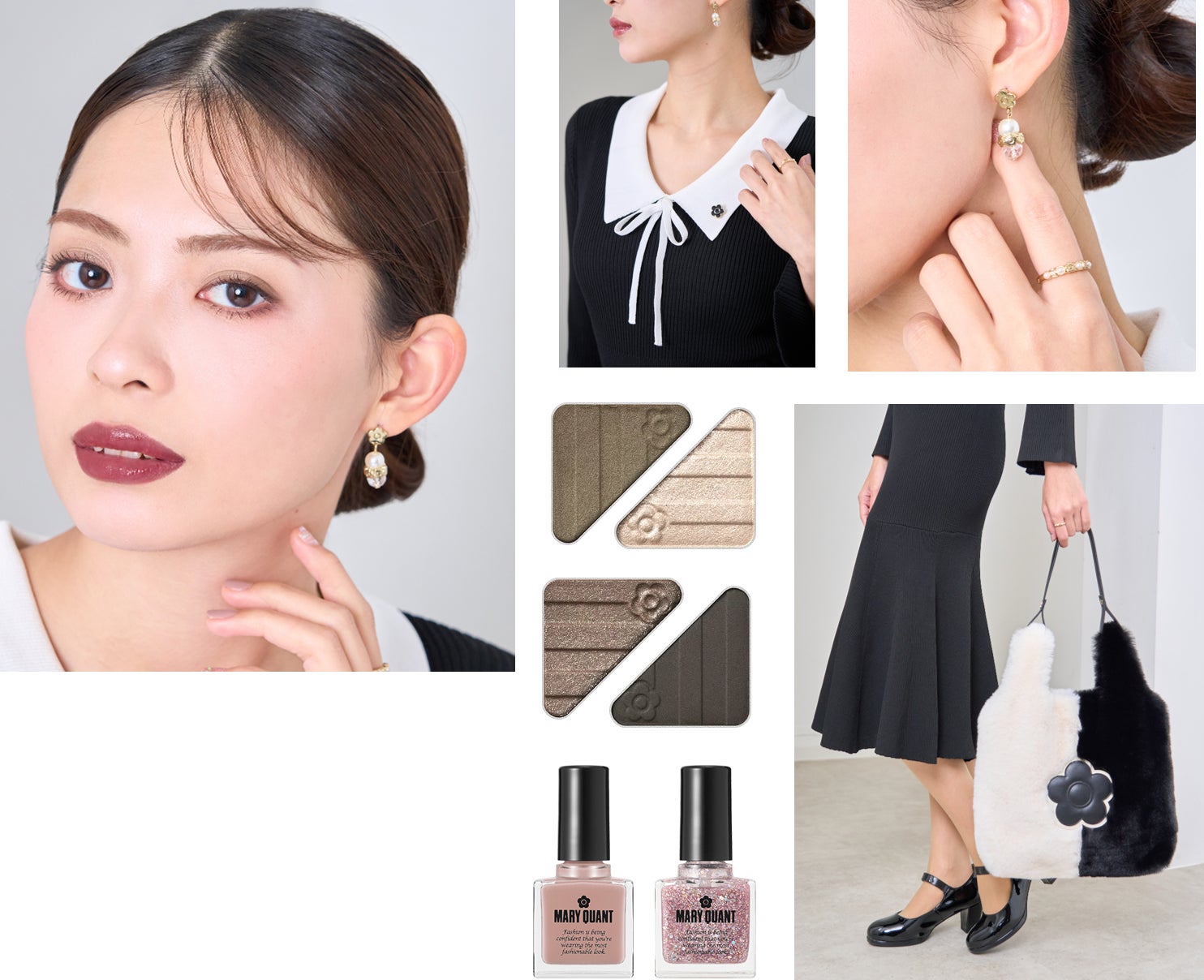 イベントの多いホリデーシーズンは、お友だちや家族と外出が増える時季。マリークヮントからこの季節にぴったりの、ロマンティックとカジュアルをMIXしたエレガントカジュアルなスタイル2つをご紹介。