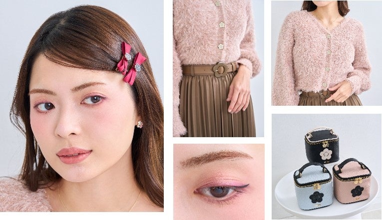 ふたつめのカーディガンスタイルは、キラキラなラメシャギーのニットカーディガンに、プリーツロングスカートを合わせてきれいめガーリーに。アイメイクは、くすみピンクにアイラインをきかせ、大人かわいい雰囲気を演出。この冬もマリークヮントには、遊び心を刺激するアイテムがいっぱいです。