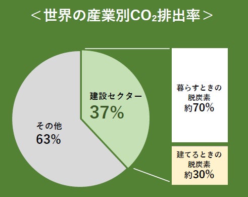 世界のCO2排出量の37%が建設セクターから排出されており※1、「暮らすときのCO2排出量(オペレーショナルカーボン)」はZEH(ゼロ・エネルギー・ハウス)やZEB(ゼロ・エネルギー・ビル)の普及で削減が進んでいます。一方、「建てるときのCO2排出量(エンボディドカーボン)」の削減が今後の課題となっており、S造やRC造に比べてエンボディドカーボンの少ない木造建築が注目されています。また、樹木は光合成により取り込んだ炭素を伐採後も木材内に固定・貯留します。これを「炭素固定」といい、脱炭素社会の実現には炭素を固定した木材を用いた木造建築の推進が不可欠です。