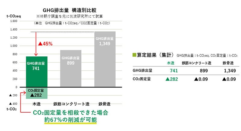 ※3. 林野庁調査をもとに住友林業の筑波研究所で試算(以下のグラフと表を参照)。林野庁「平成27年度 木材利用推進・省エネ省CO2実証業務 報告書」の資材数量をもとに3階建て事務所(1,500㎡)の躯体、外部、内部(設備除く)を対象として、新築時から解体時までのライフサイクル全体を対象として算定しました。